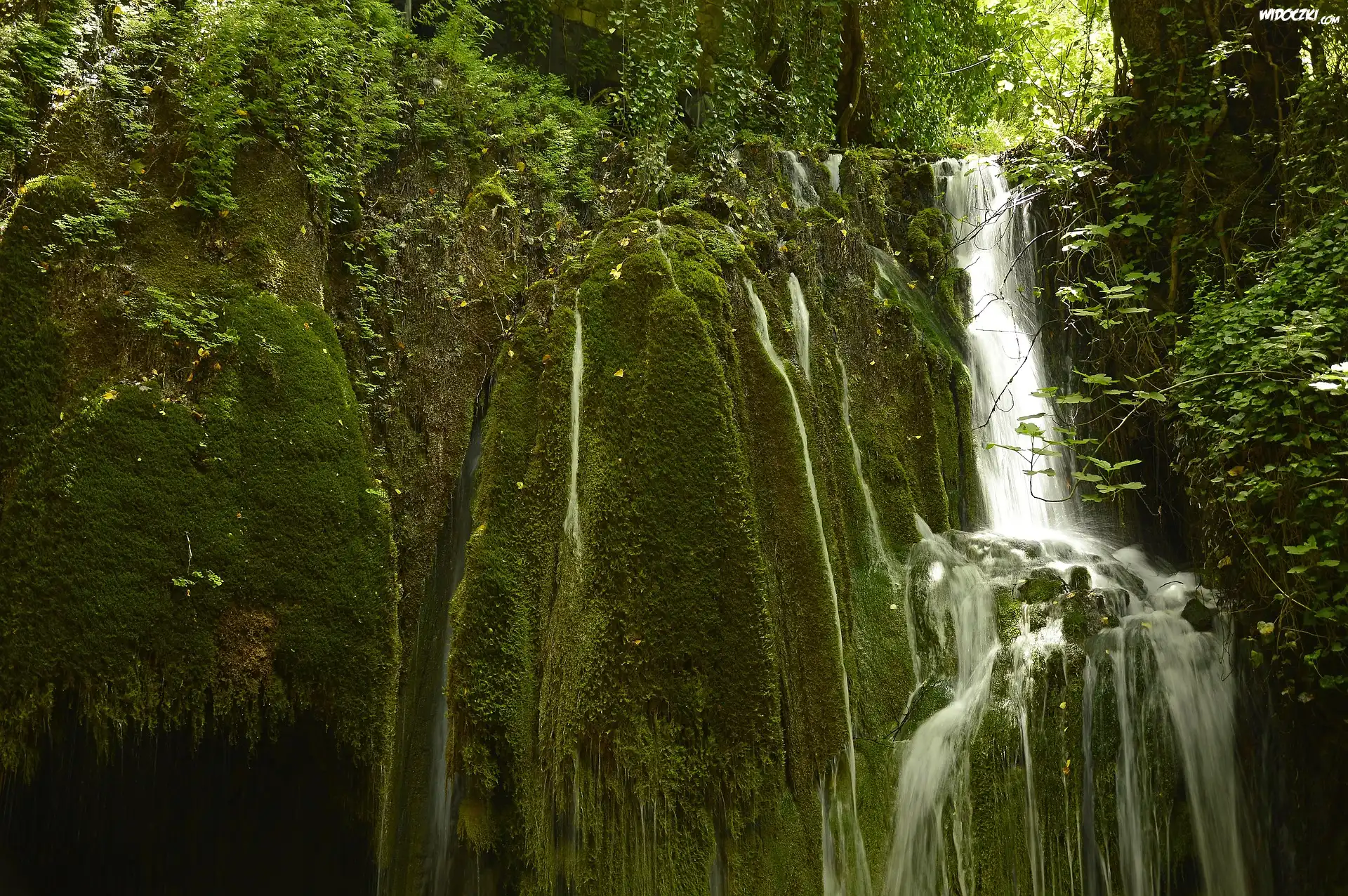 Wodospad, Omszałe, Skały, Rośliny