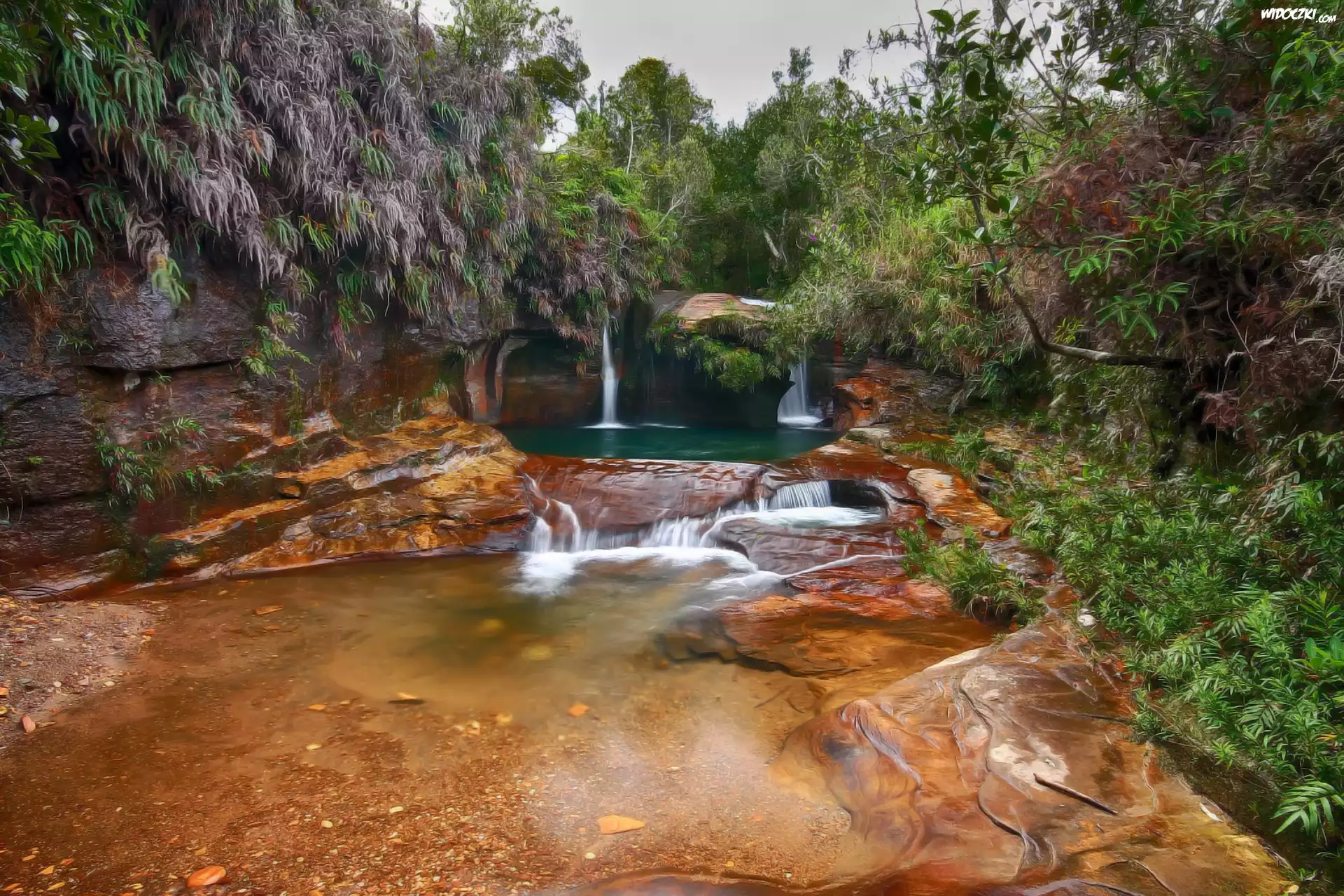 Zdjęcia, Wodospad, Rzeczka, Skały, Drzewa