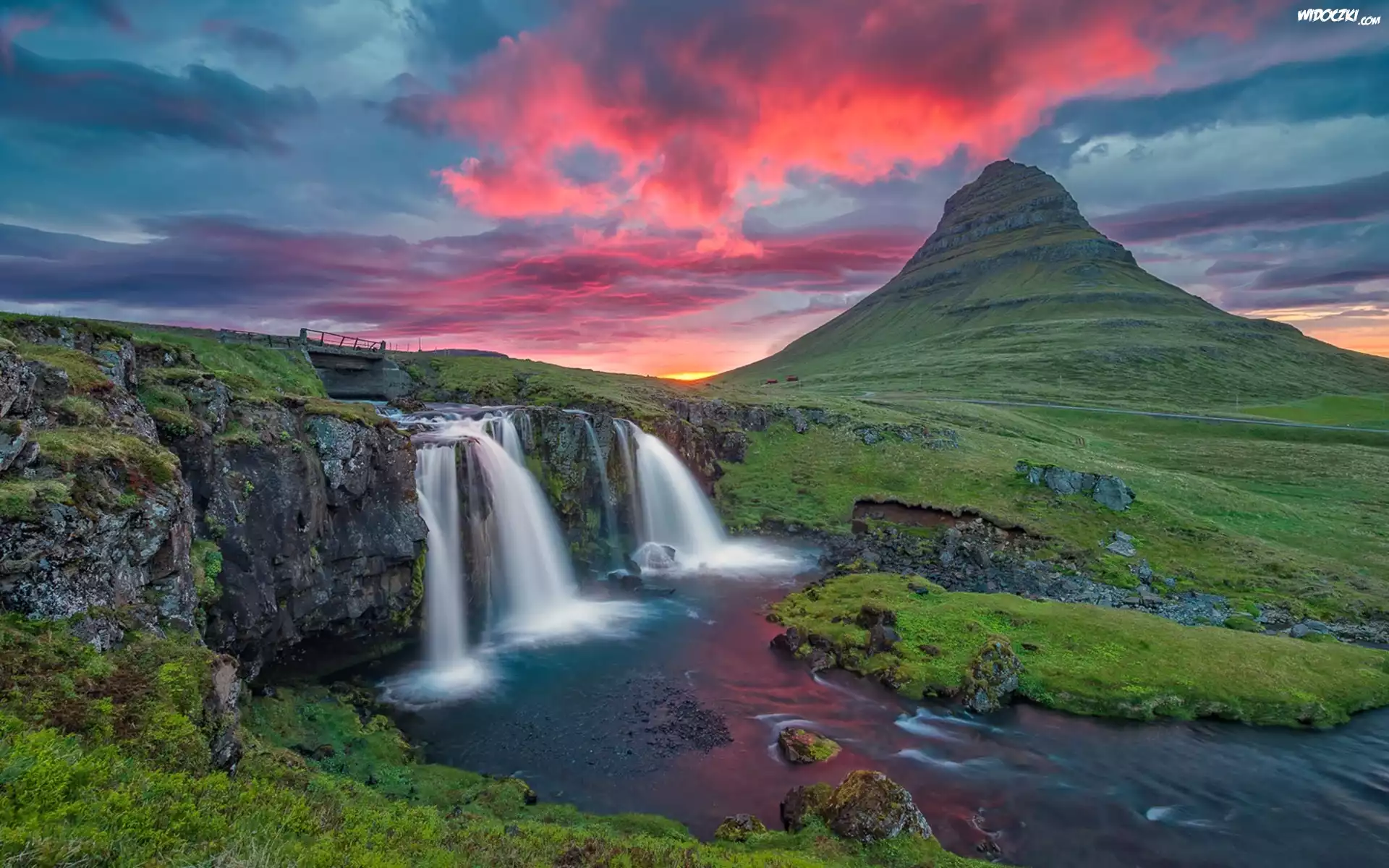 Zdjęcia, Wodospad, Rzeka, Góry, Zachód Słońca, Mostek, Islandia
