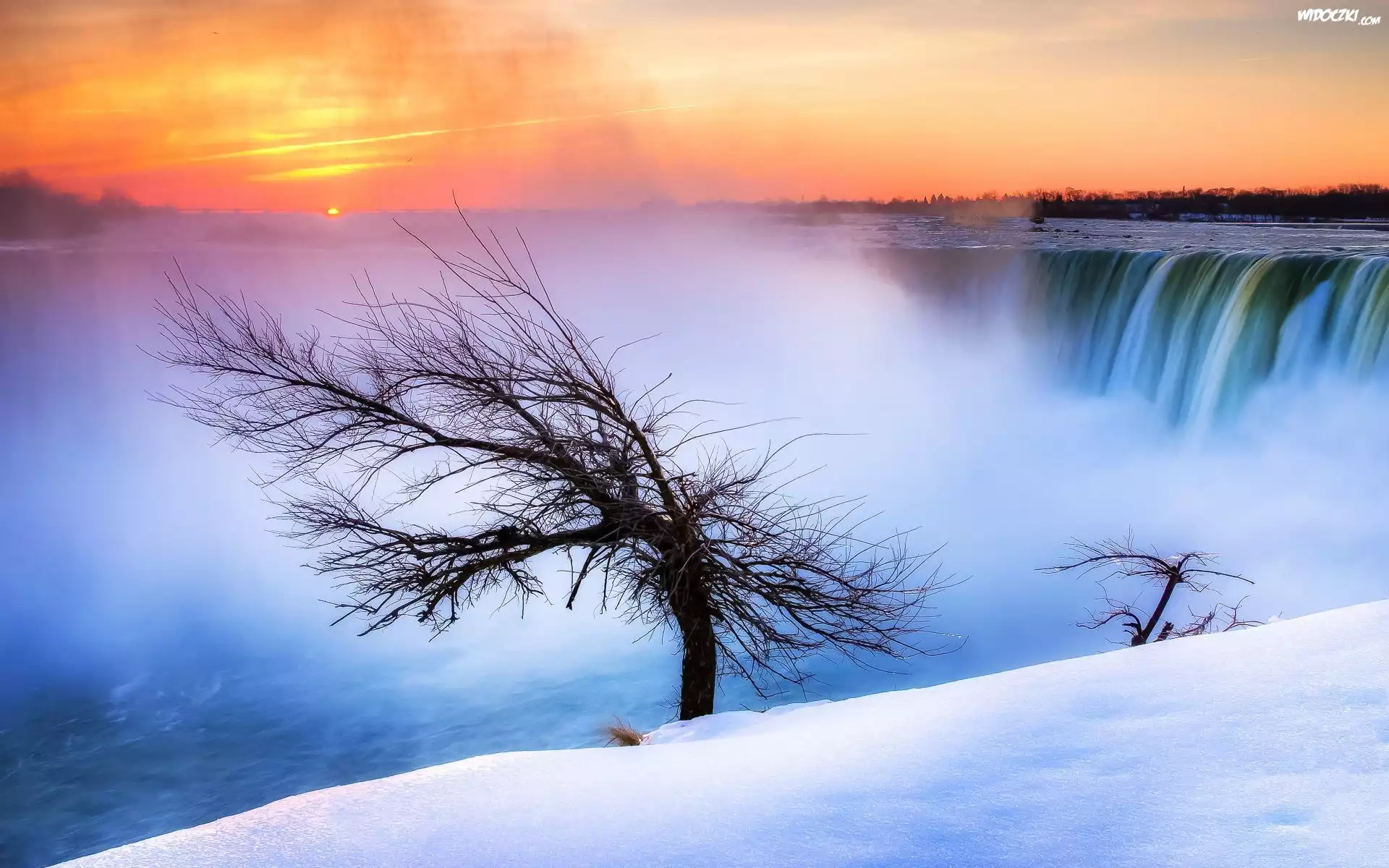 Zdjęcia, Wodospad, Drzewo, Wschód, Słońca, Zima