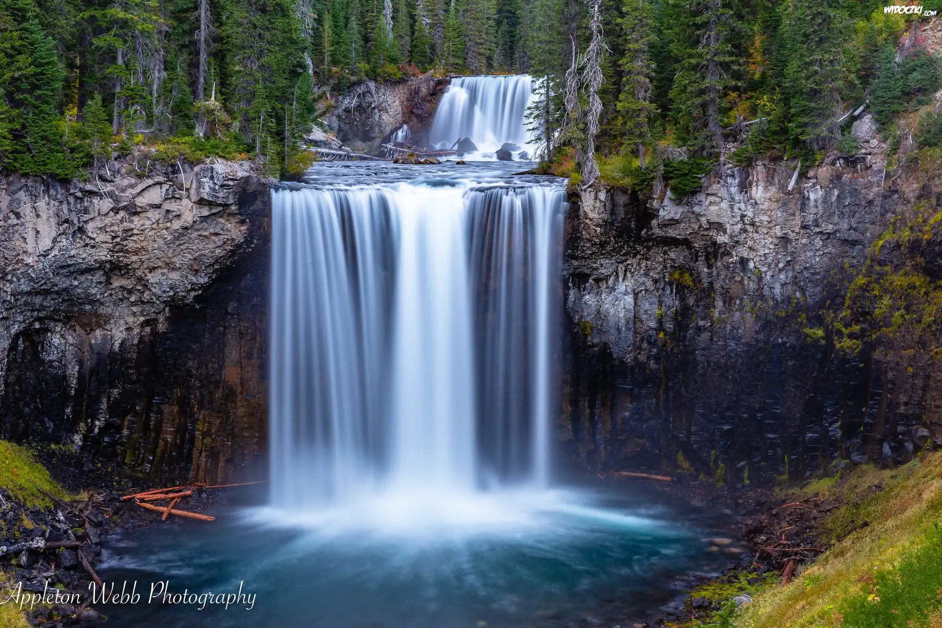 Wodospad Colonnade Falls, Rzeka Bechler River, Skały, Las, Drzewa, Park Narodowy Yellowstone, Stan Wyoming, Stany Zjednoczone |