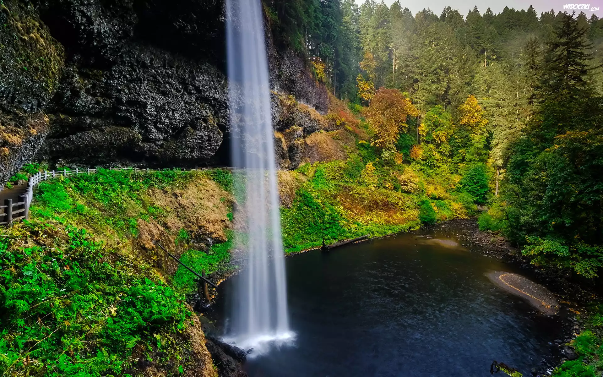 Wodospad South Falls, Las, Drzewa, Skały, Jezioro, Roślinność, Park stanowy Silver Falls, Stan Oregon, Stany Zjednoczone |