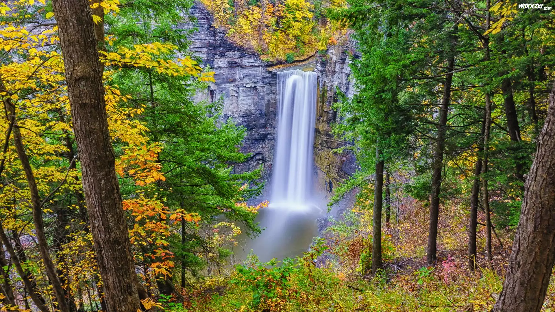 Wodospad, Taughannock Falls, Skały, Drzewa, Stan Nowy Jork, Stany Zjednoczone