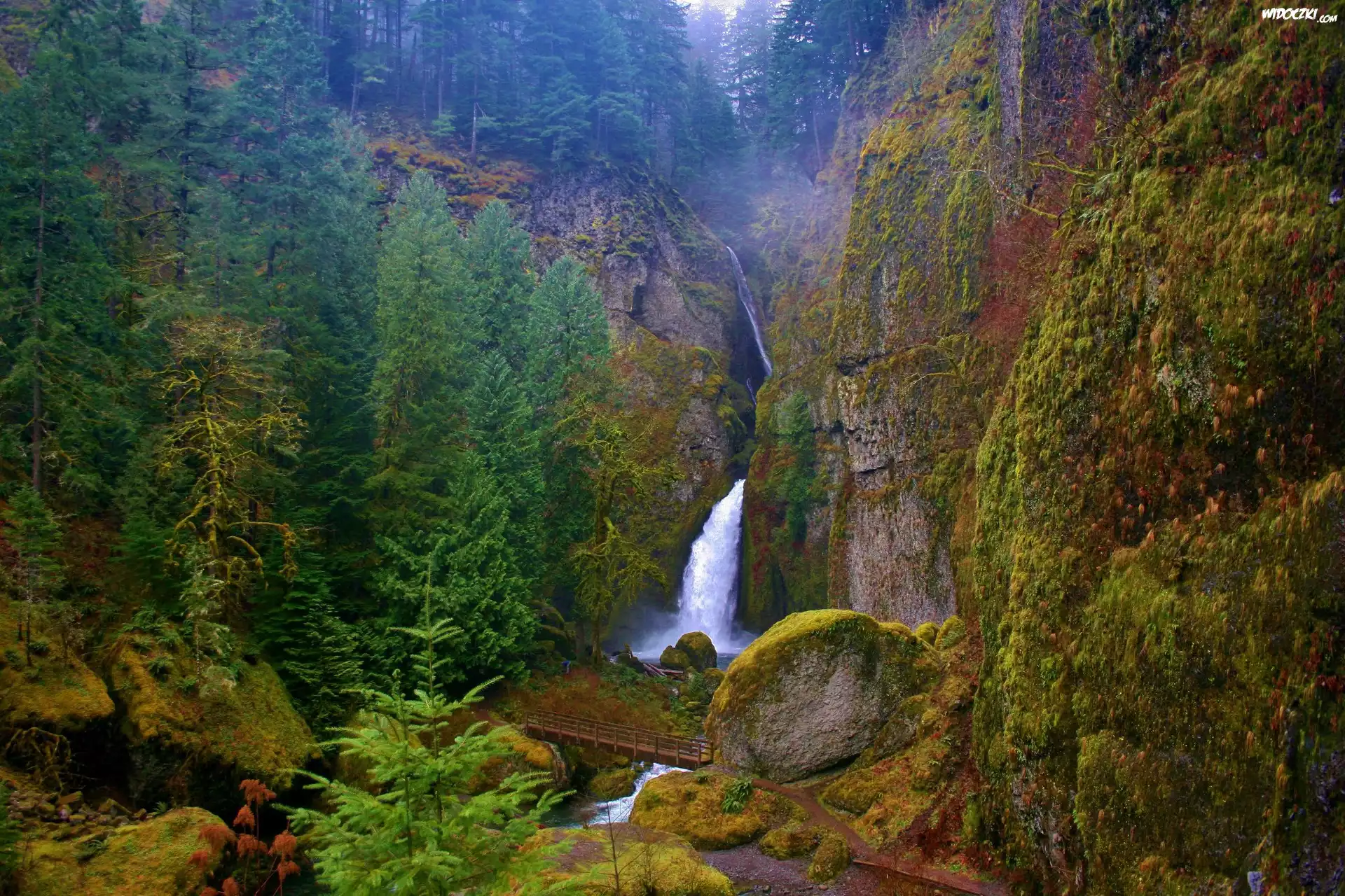 Góra, Wodospady, Morze Tęcza, Las, Góry Wodospad Las, Mostek, Drzewa Skaliste, Wybrzeże Las, Przechodzące Światło Jesień, Paprocie Noc, Drzewa, Księżyc Wodospad w lesie Góry, Budowle, Skały Wodospad, Las Płot, Młyn, Wodny Zachód Śłońca, Las, Drzewo Wodospad Góry, Lasy, Rzeka