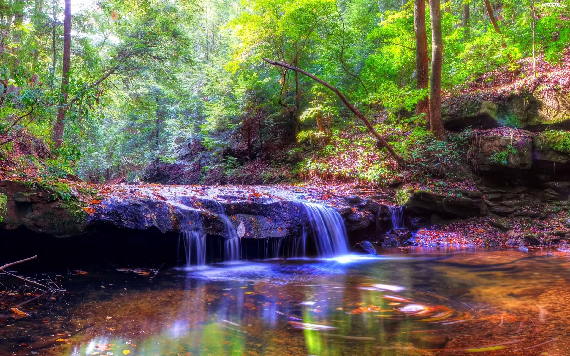 Wodospad, Skały, Las, Przebijające, Światło, Jesień