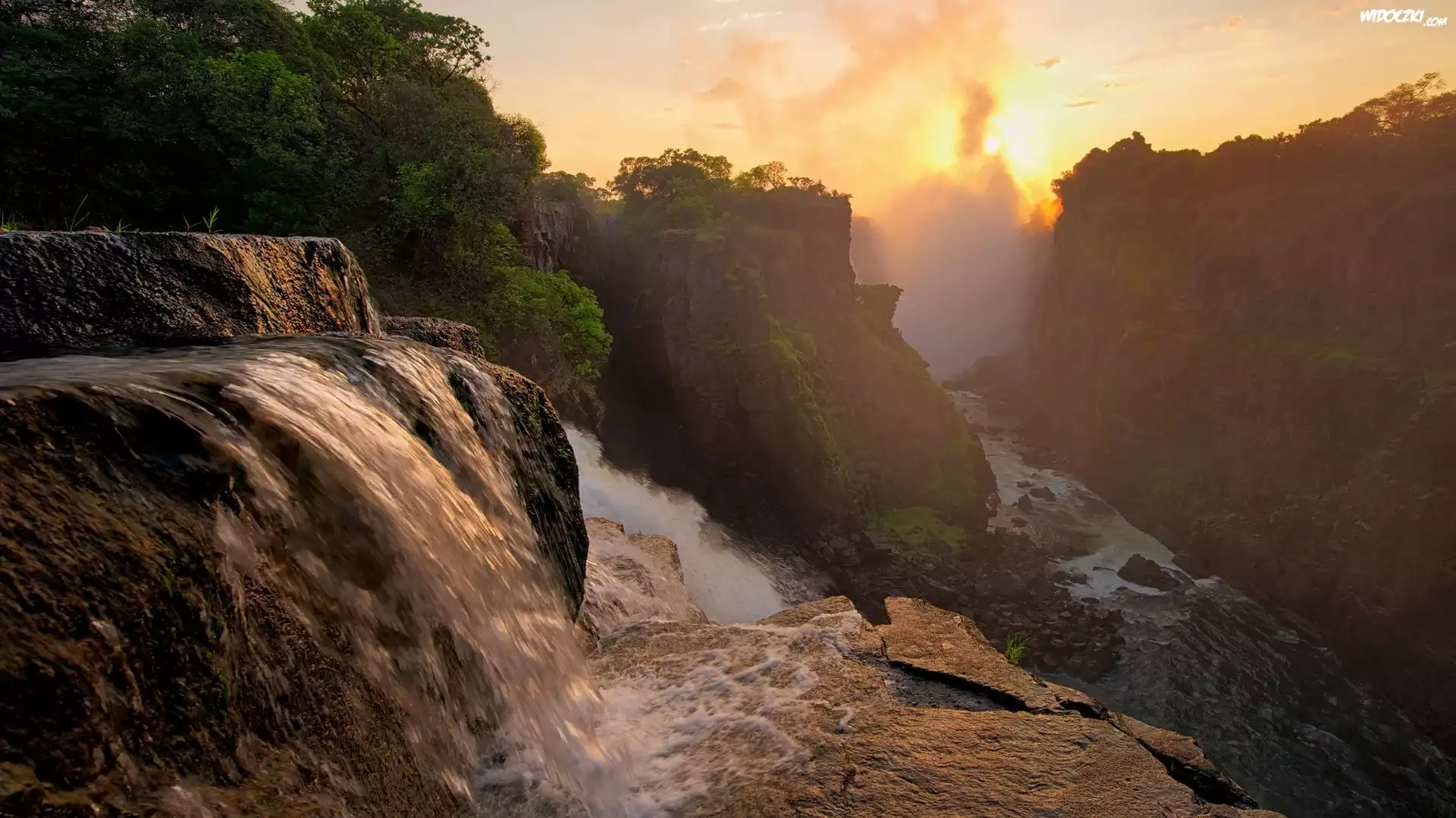Zdjęcia, Wodospad, Skały, Przebijające, Światło, Mgła