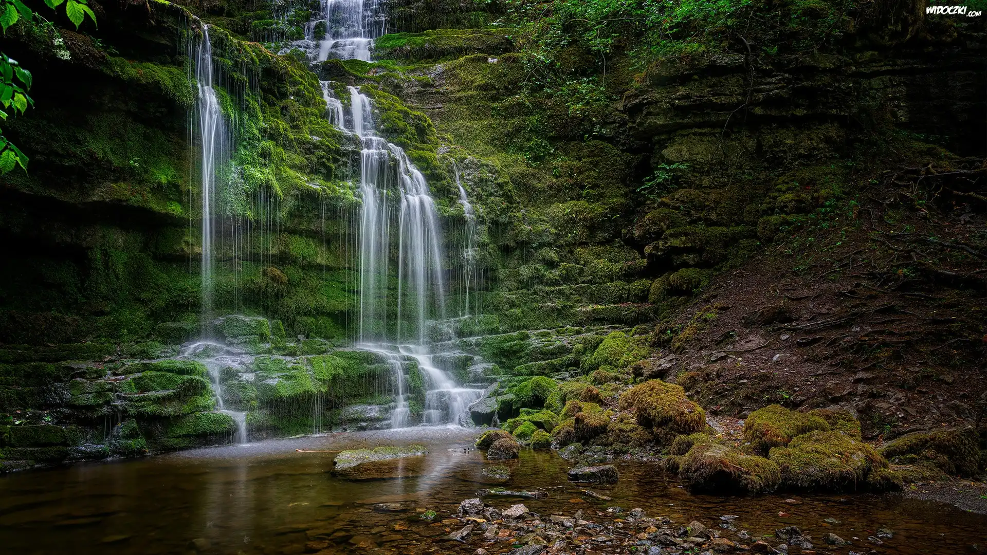 Wodospad, Scaleber Force Falls, Park Narodowy Yorkshire Dales, Omszałe, Skały, Kamienie, Rośliny, Hrabstwo North Yorkshire, Anglia |