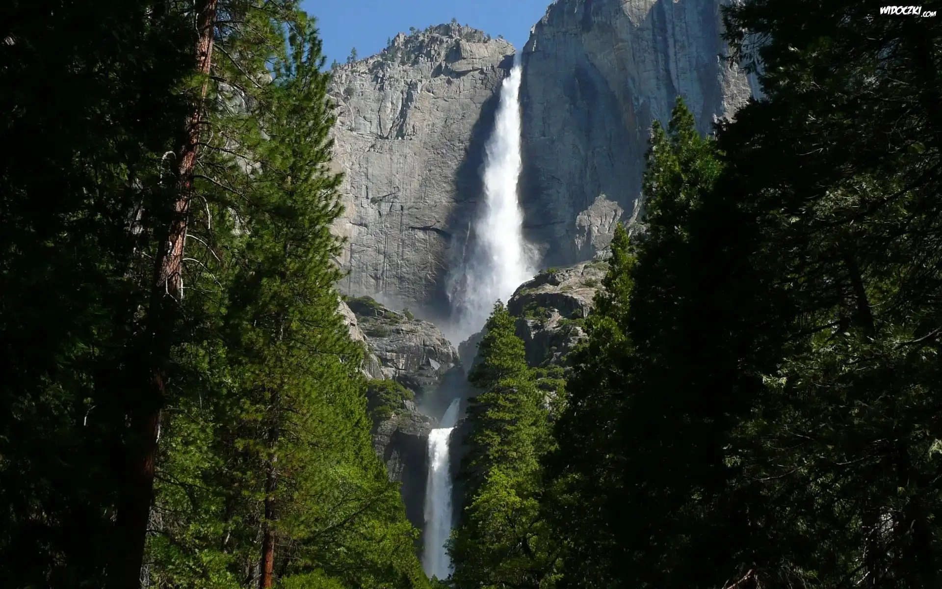 Zdjęcia, Wodospad, Skały, Drzewa, Yosemite, Kalifornia