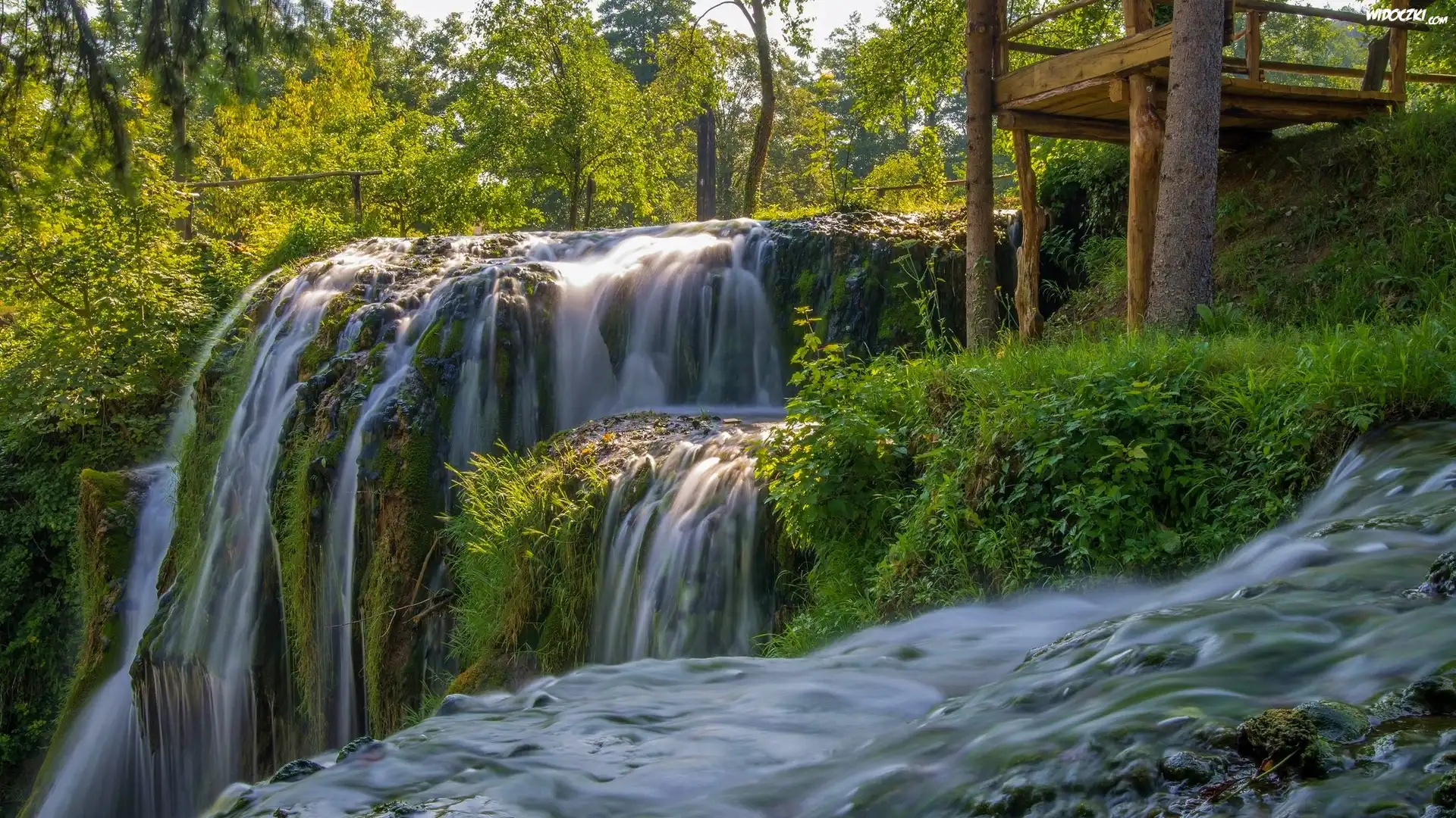 Zdjęcia, Wodospad, Rzeka, Zieleń, Pomost