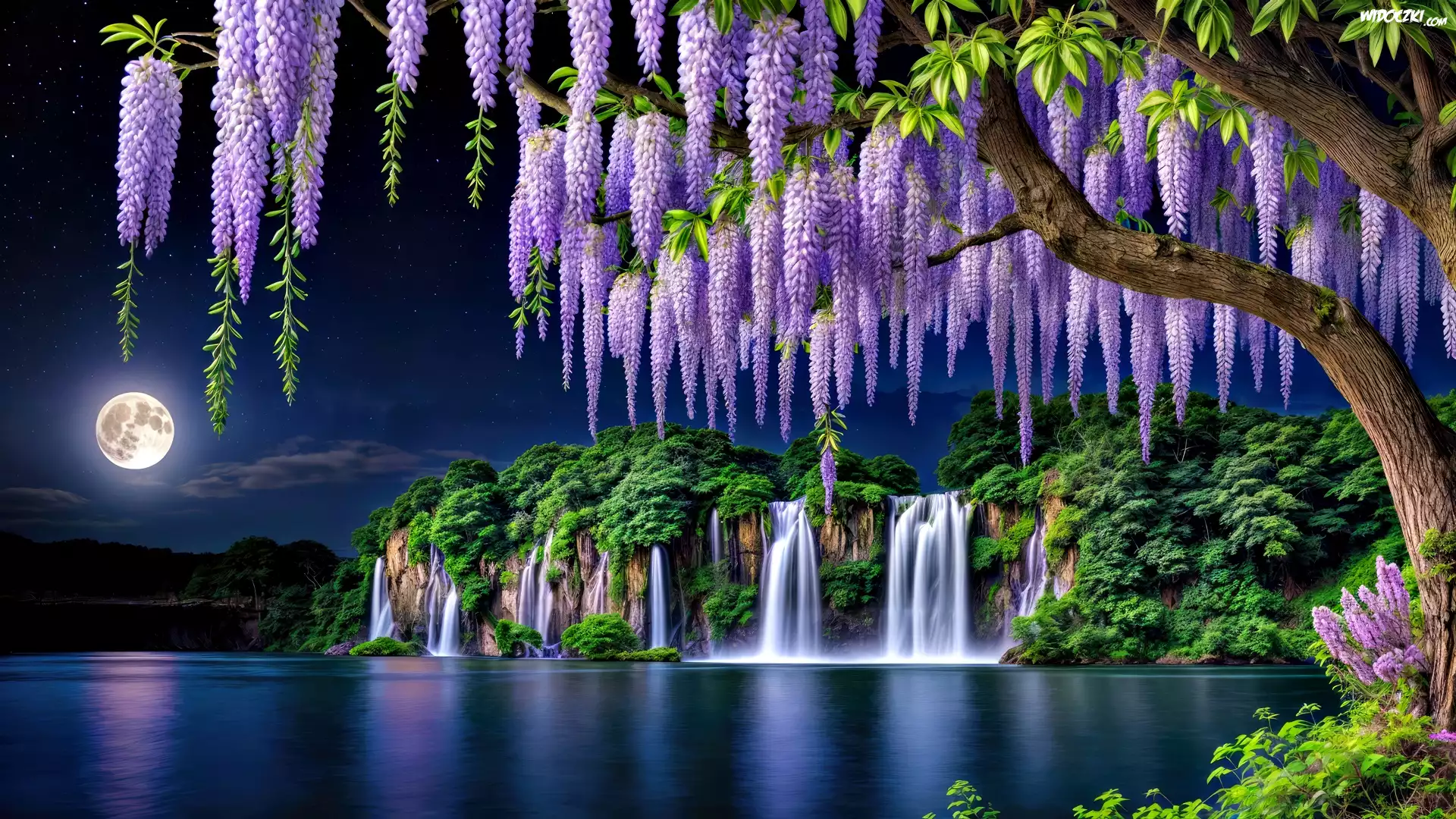 Glicynia, Kwiaty, Jezioro, Wodospady, Noc, Grafika