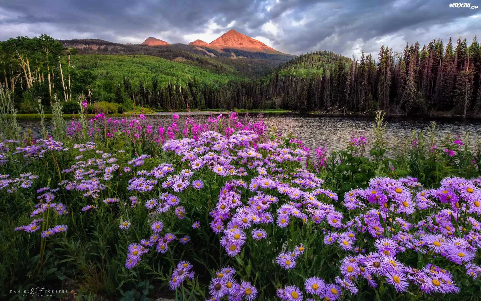 Zdjęcia, Stany Zjednoczone, Kolorado, Telluride, Góry, Jezioro, Woods Lake, Kwiaty, Astry, Drzewa
