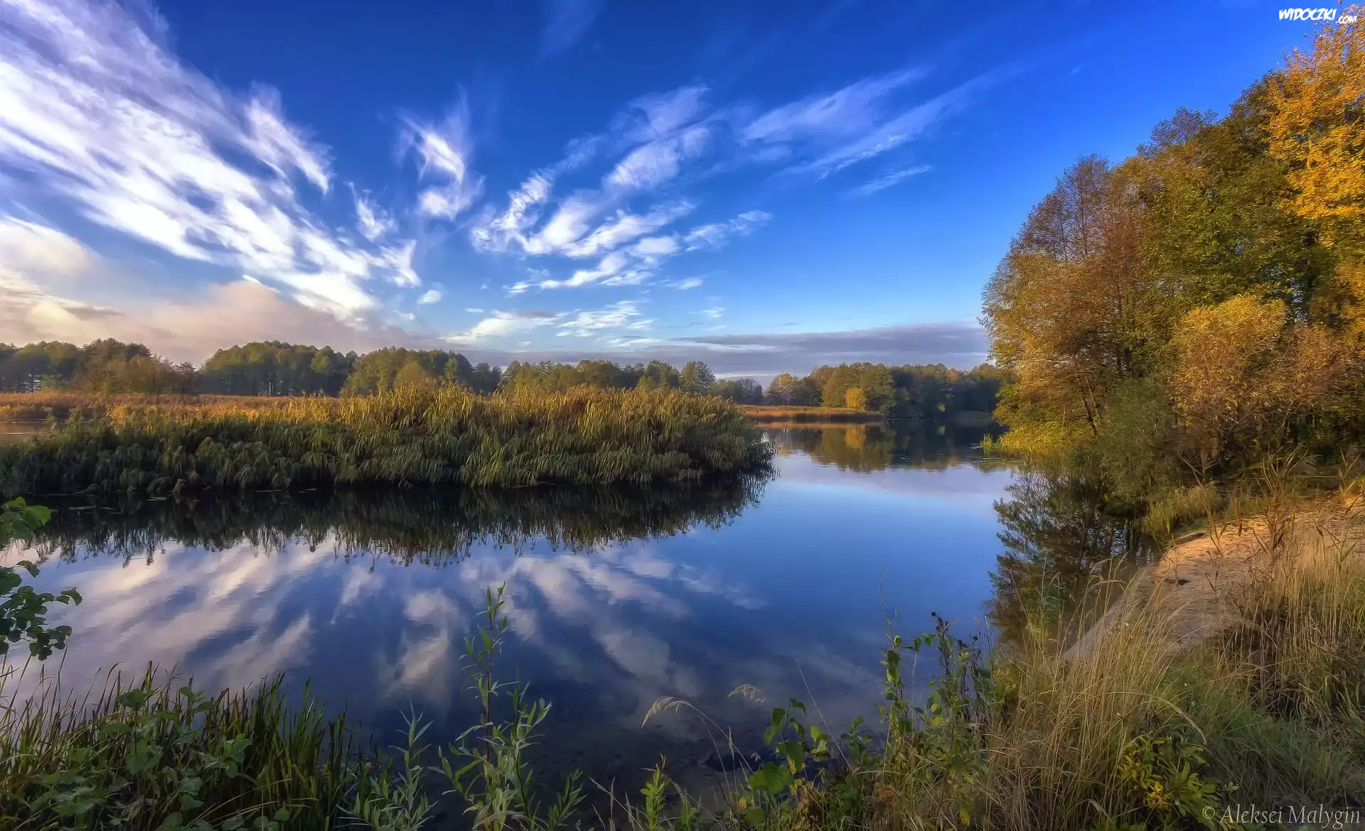 Rzeka Woroneż, Miejscowość Chertovitsy, Rosja, Drzewa, Chmury