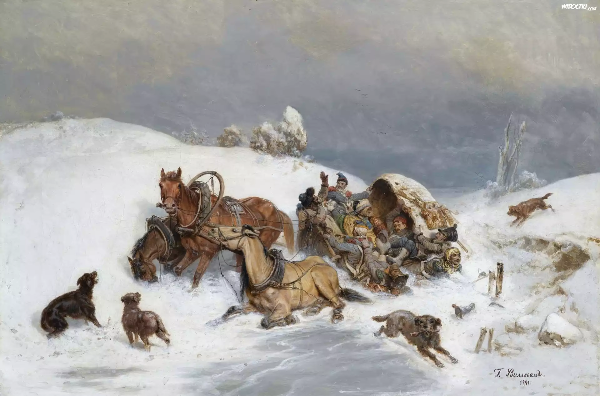 Obraz, Bogdan Willewalde, Zima, Konie, Trojka, Psy, Przewrócony, Wóz
