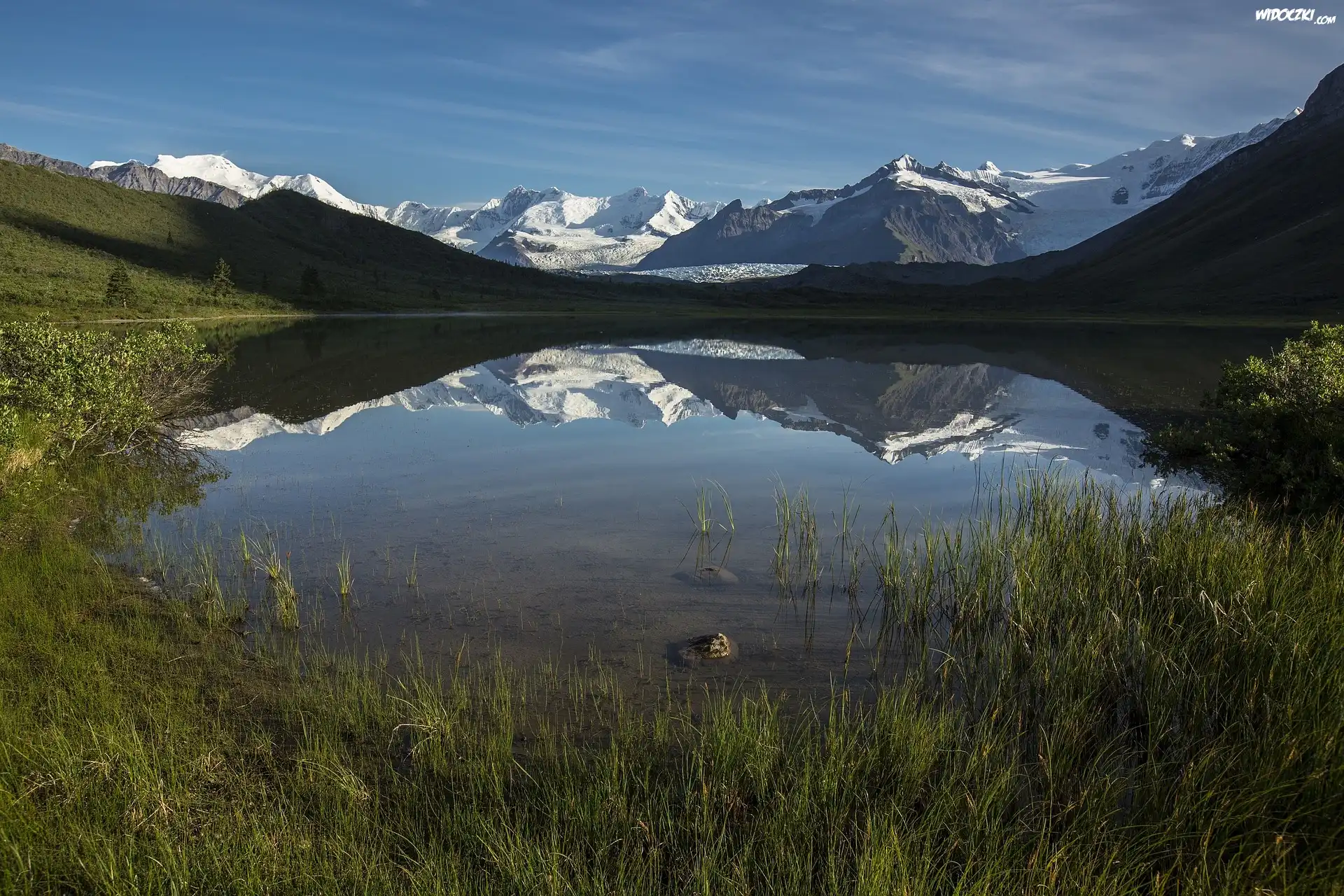 Zdjęcia, Góry, Śnieg, Jezioro, Park Narodowy Wrangla-Świętego Eliasza, Stan Alaska, Stany Zjednoczone