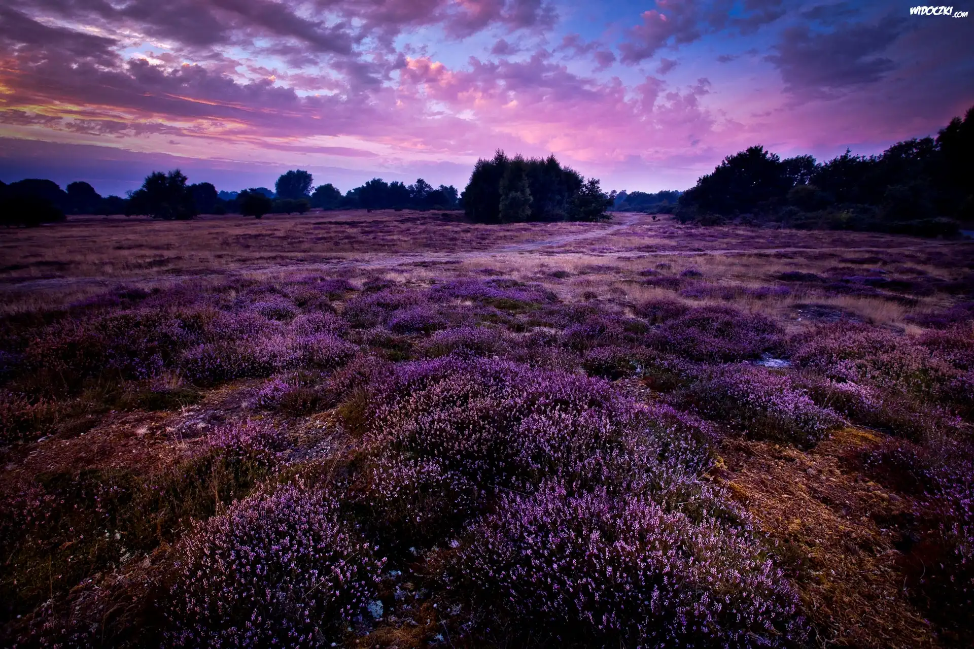 Wrzos, Zachód, Słońca, Chmury, Drzewa, Wrzosowisko