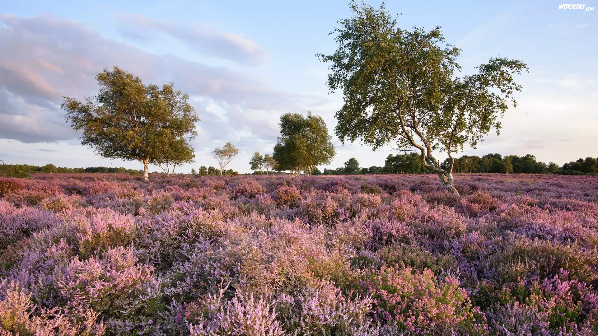 Zdjęcia, Wrzosowisko, Wrzosy, Drzewa, Brzozy
