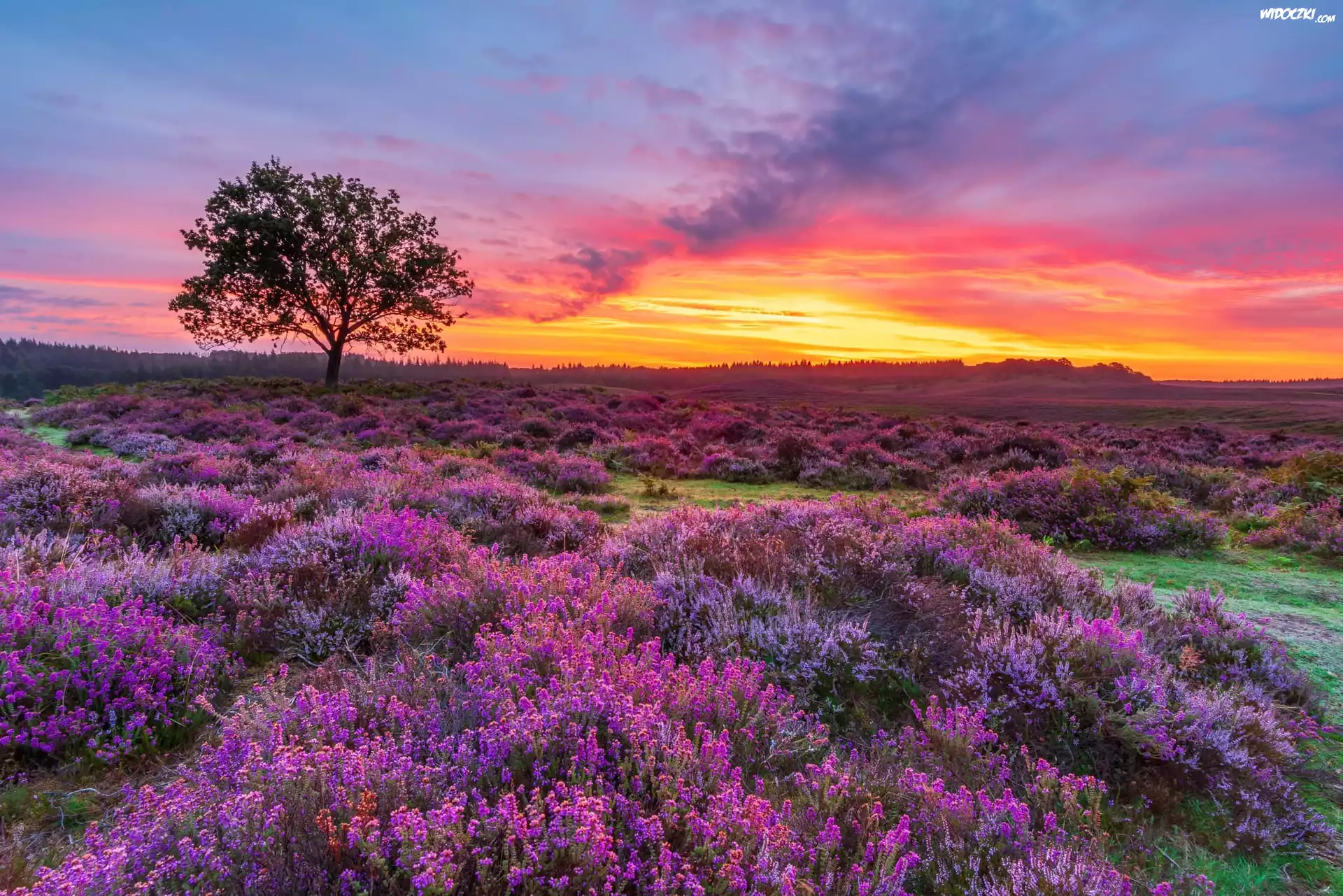 Zdjęcia, Wschód słońca, Wrzosy, Wrzosowisko, Drzewo, Southampton, Park Narodowy New Forest, Anglia, Wielka Brytania