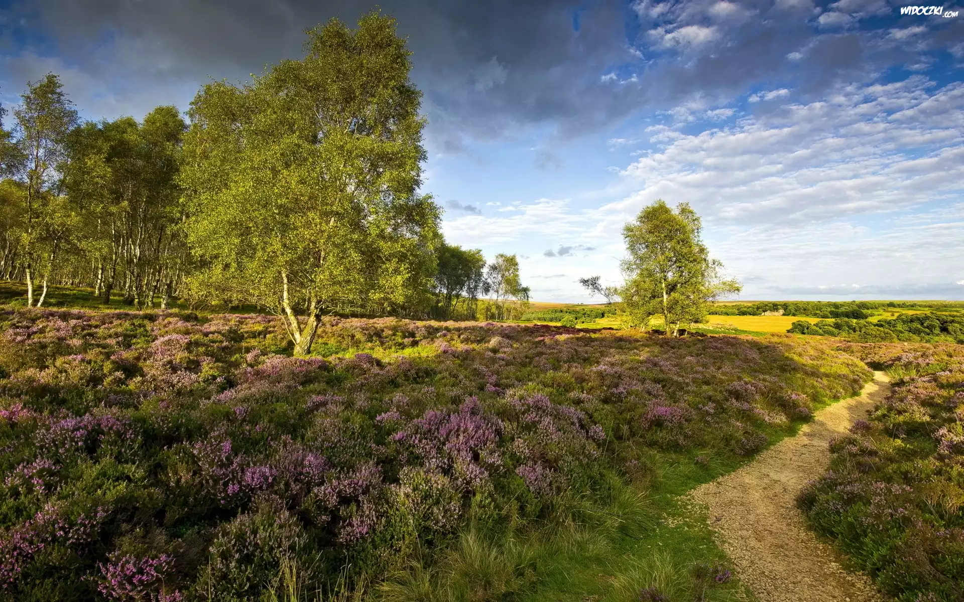 Zdjęcia, Wrzosy, Pole, Drzewa, Ścieżka