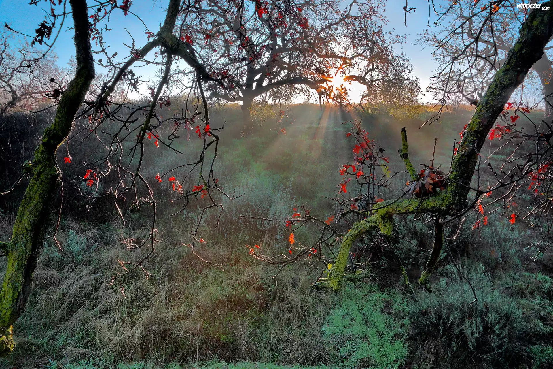 Wschód Słońca, Łąka, Drzewa