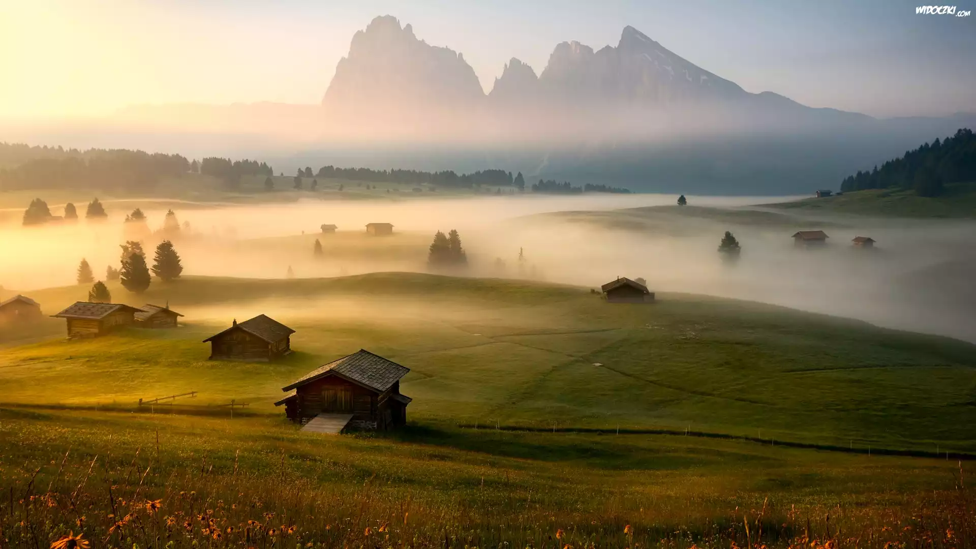 Wschód słońca, Mgła, Góry Sassolungo, Dolomity, Domy, Płaskowyż Seiser Alm, Dolina Val Gardena, Łąki, Włochy |