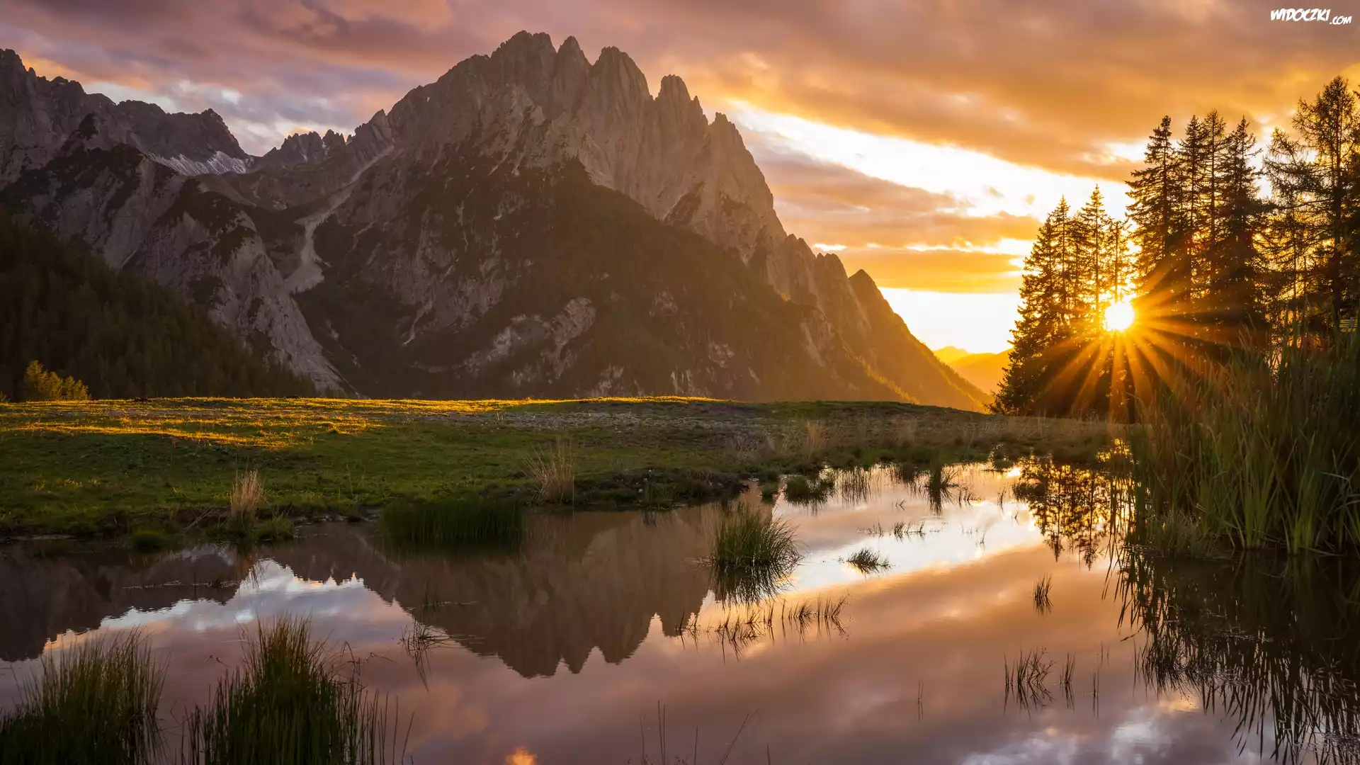 Góry, Drzewa, Jezioro, Wschód słońca, Chmury