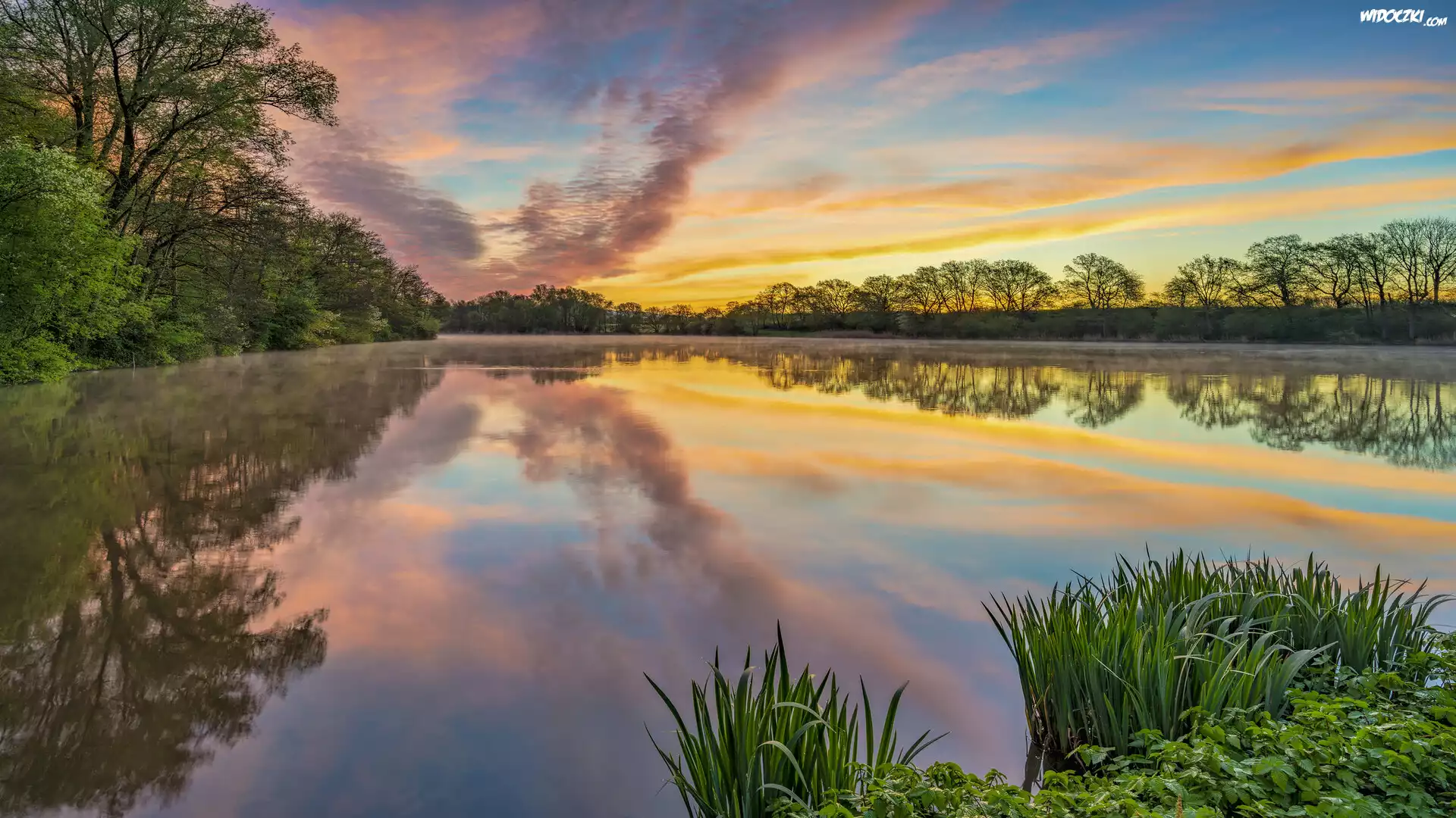 Zdjęcia, Wschód słońca, Chmury, Drzewa, Jezioro Sterenbachsee, Dolina Wittlicha, Niemcy