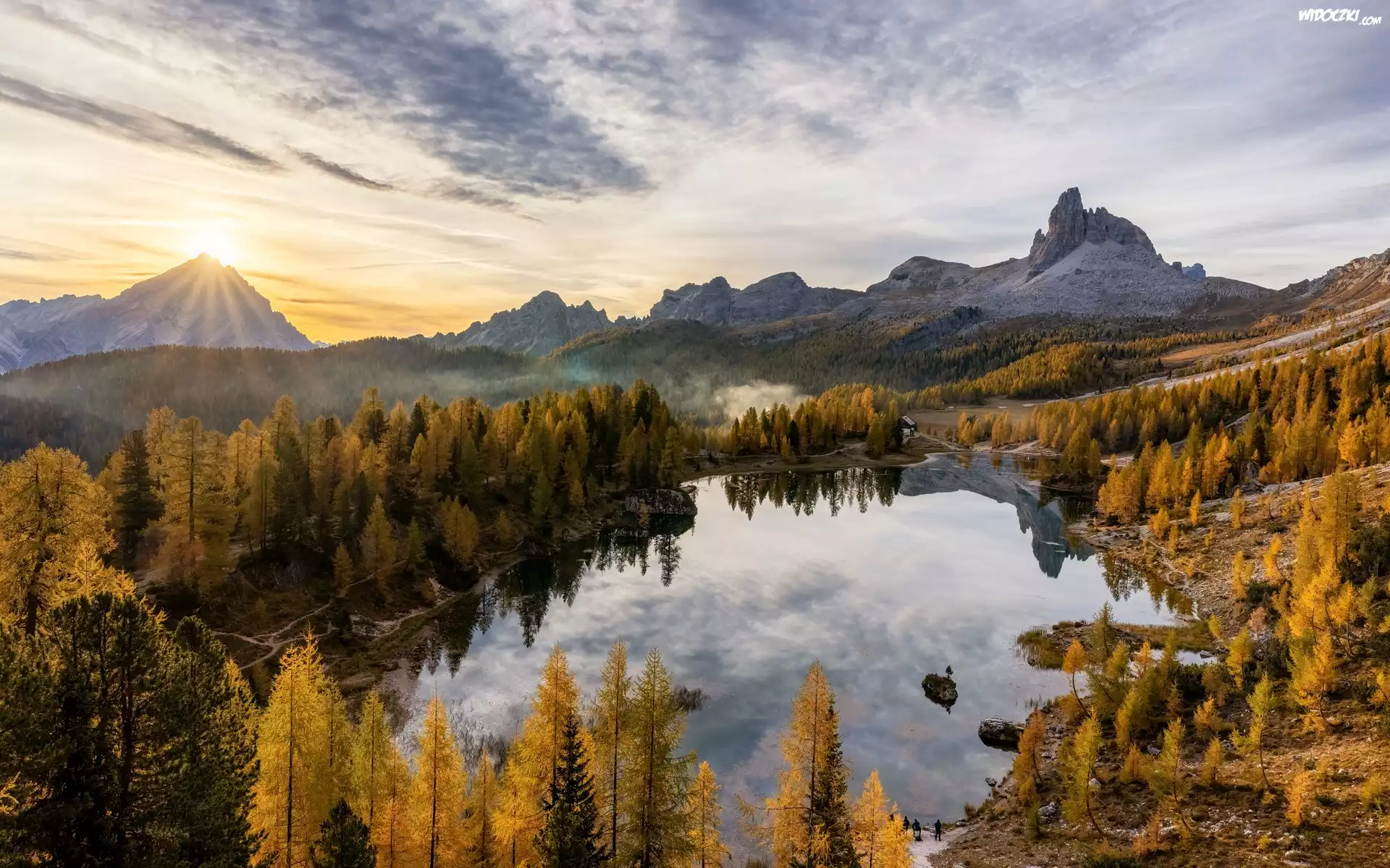 Jezioro, Federa Lake, Góry, Dolomity, Las, Drzewa, Jesień, Wschód słońca, Mgła, Prowinca Belluno, Włochy |