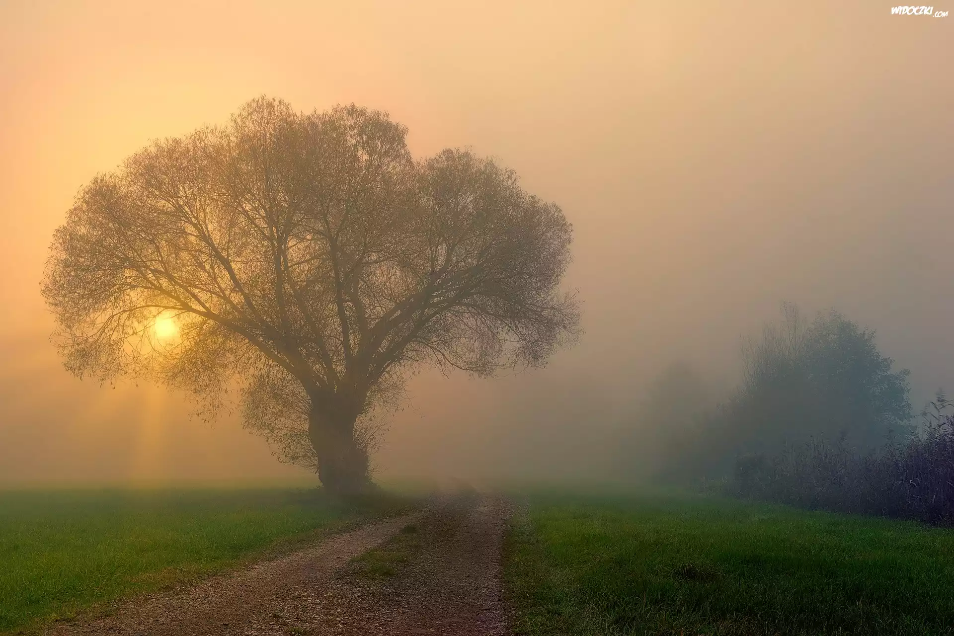 Zdjęcia, Wschód słońca, Mgła, Pole, Droga, Drzewa