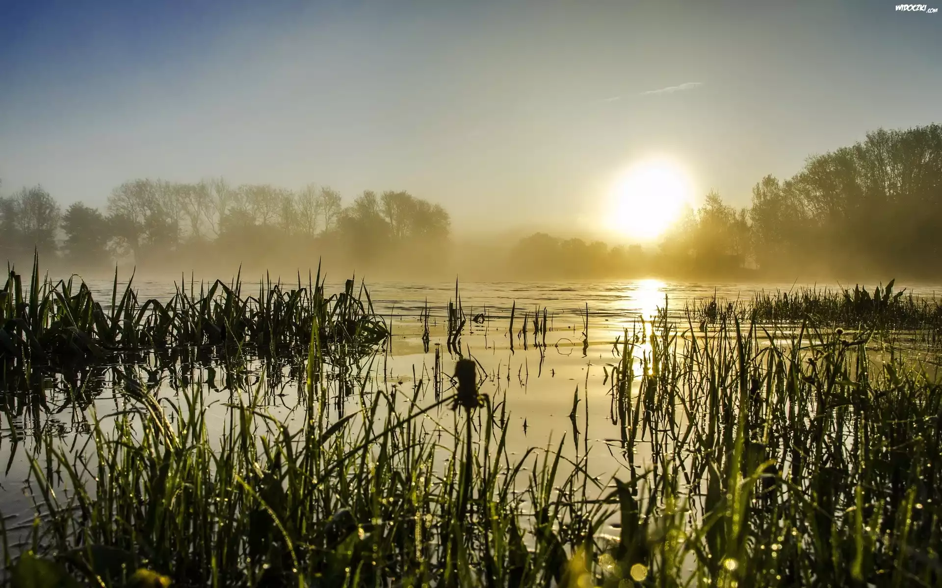 Wschód, Słońca, Jezioro, Tatarak, Drzewa, Mgła