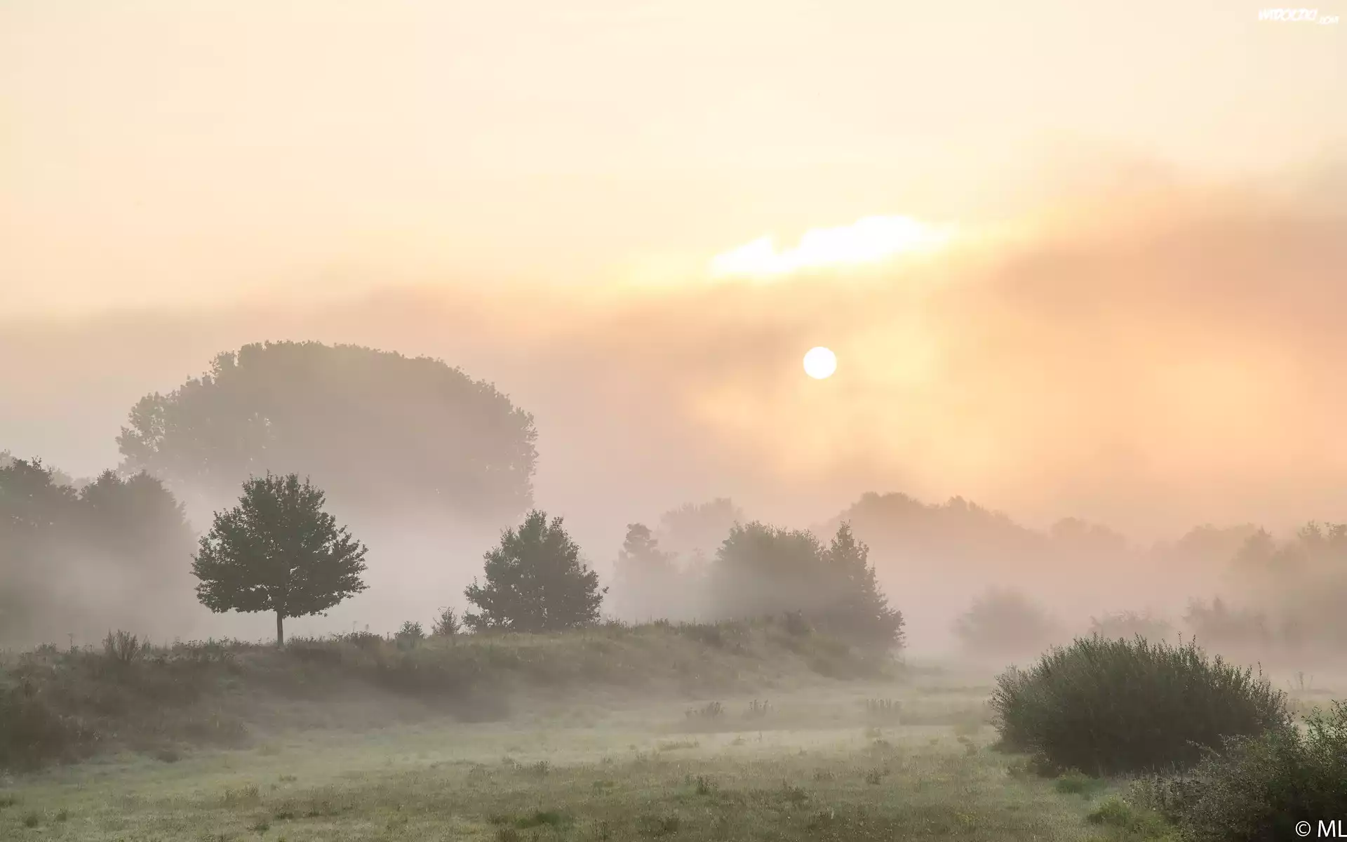 Wschód słońca, Mgła, Drzewa, Krzewy