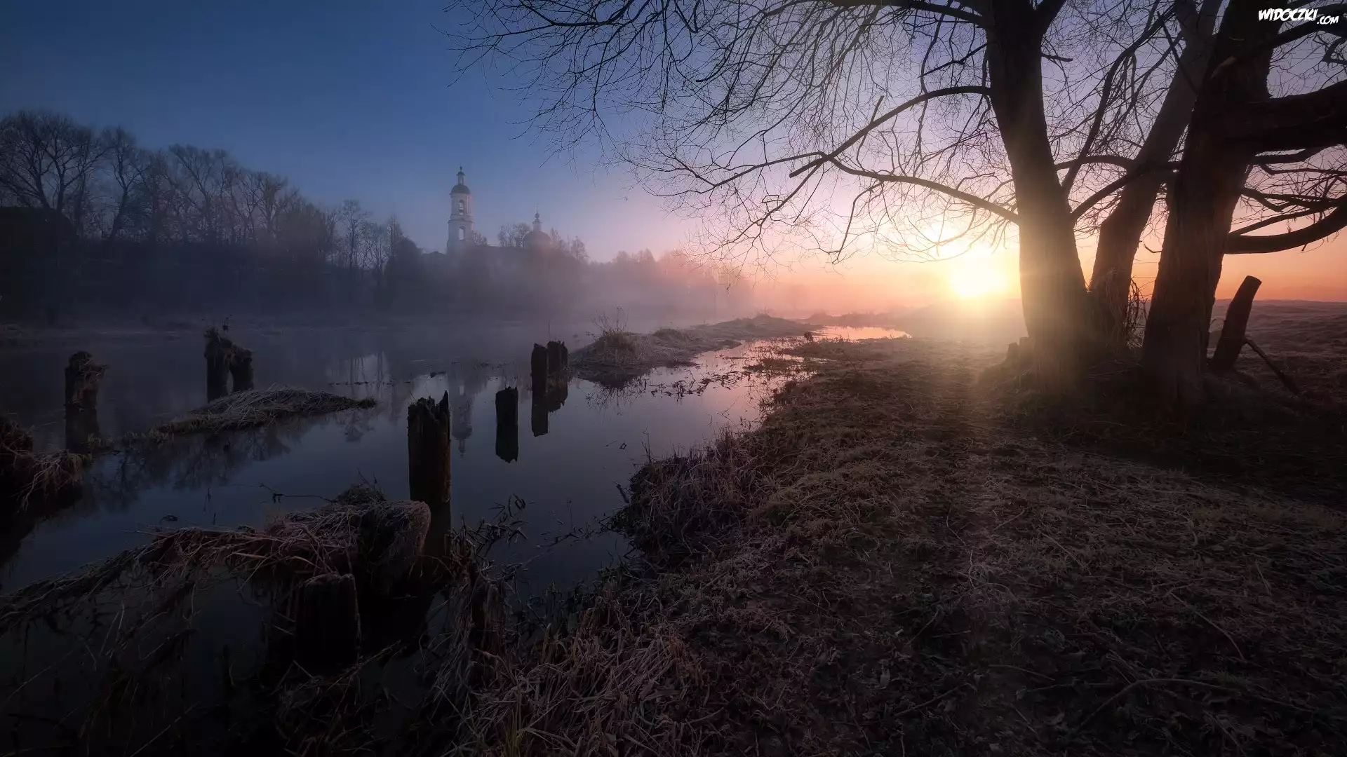 Poranek, Wschód słońca, Rzeka, Mgła, Cerkiew, Wieża, Drzewa