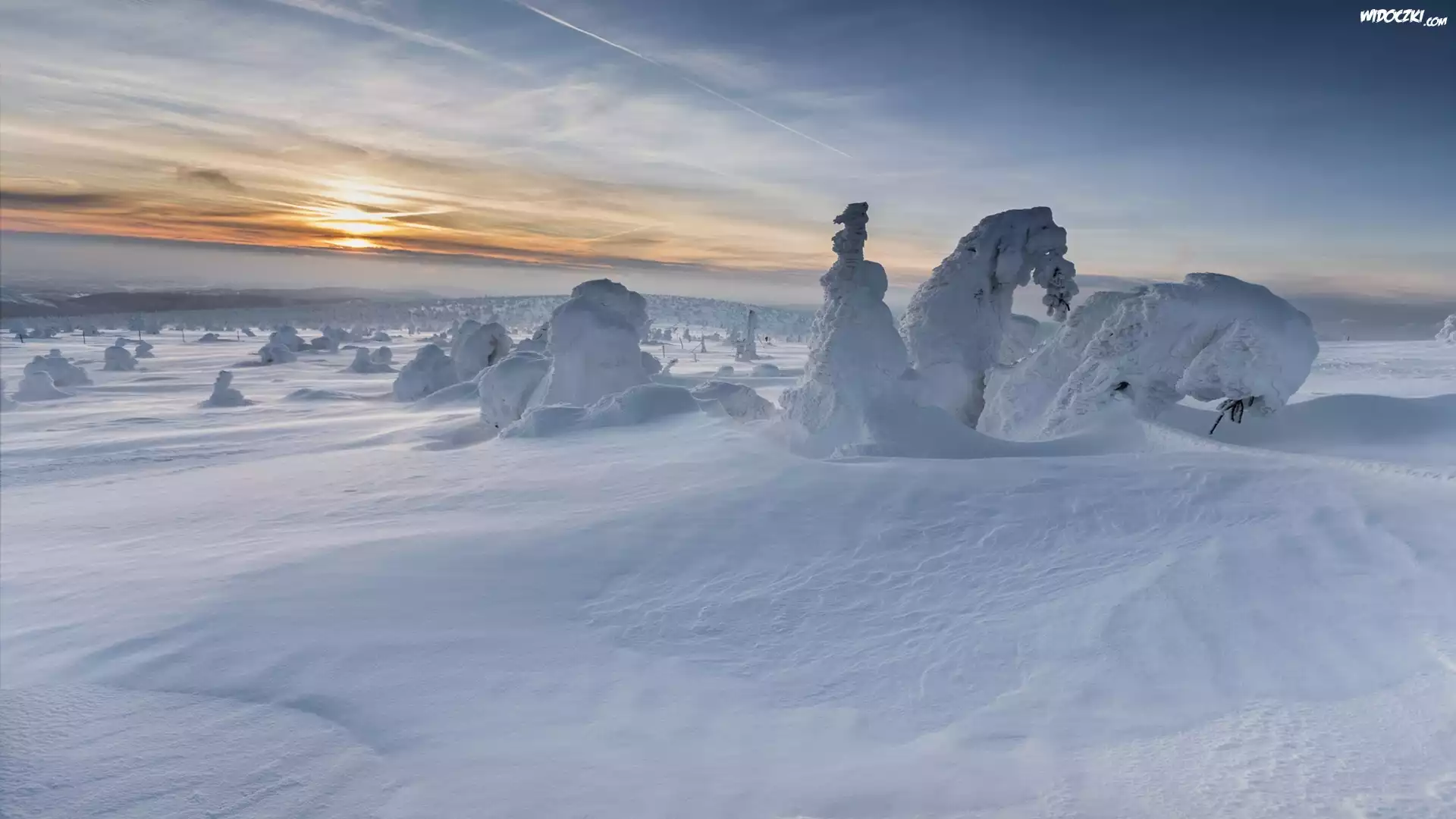 Wschód słońca, Zaśnieżone, Drzewa, Zima