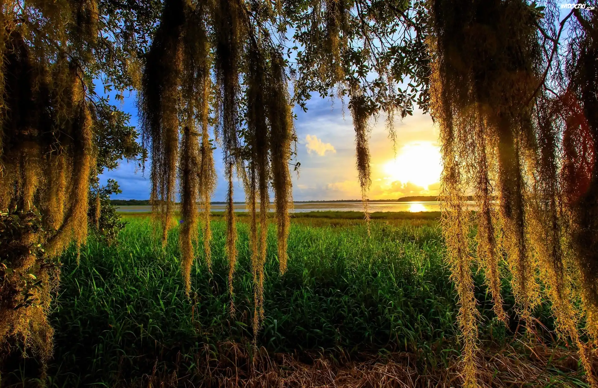 Zdjęcia, Wschód Słońca, Rzeka, Drzewo, Zarośla