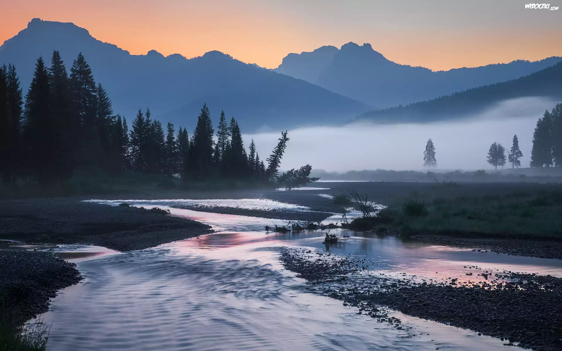Wschód słońca, Poranek, Góry, Mgła, Rzeka, Drzewa, Roślinność, Park Narodowy Yellowstone, Stany Zjednoczone |