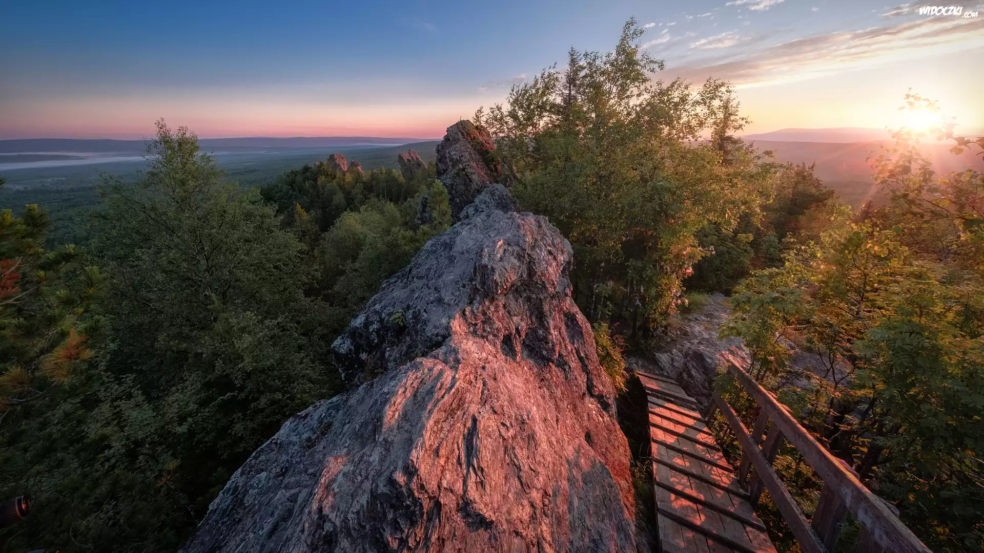Zdjęcia, Wschód słońca, Poranek, Góry, Ural, Skały, Drzewa, Kładka, Mount Kolpaki, Kraj Permski, Rosja