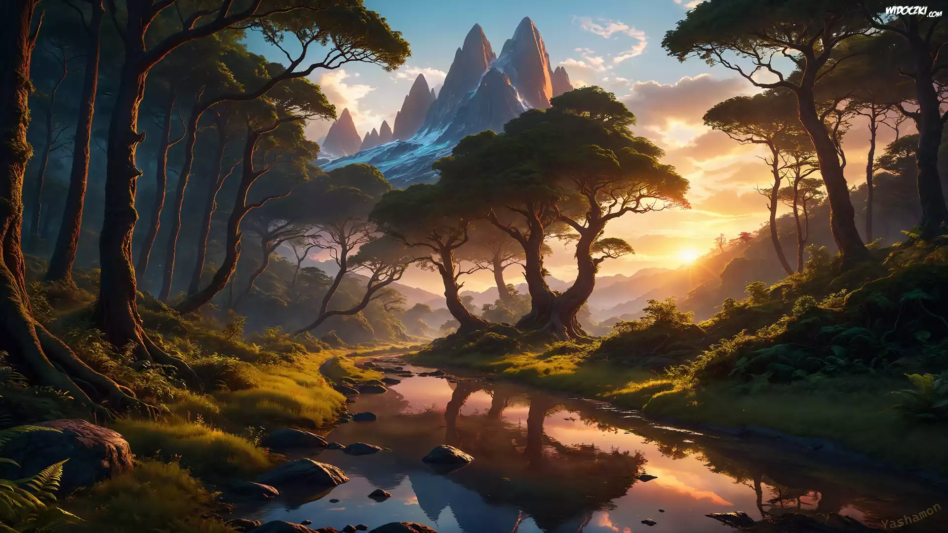 Góry, Rzeka, Drzewa, Wschód słońca, Grafika