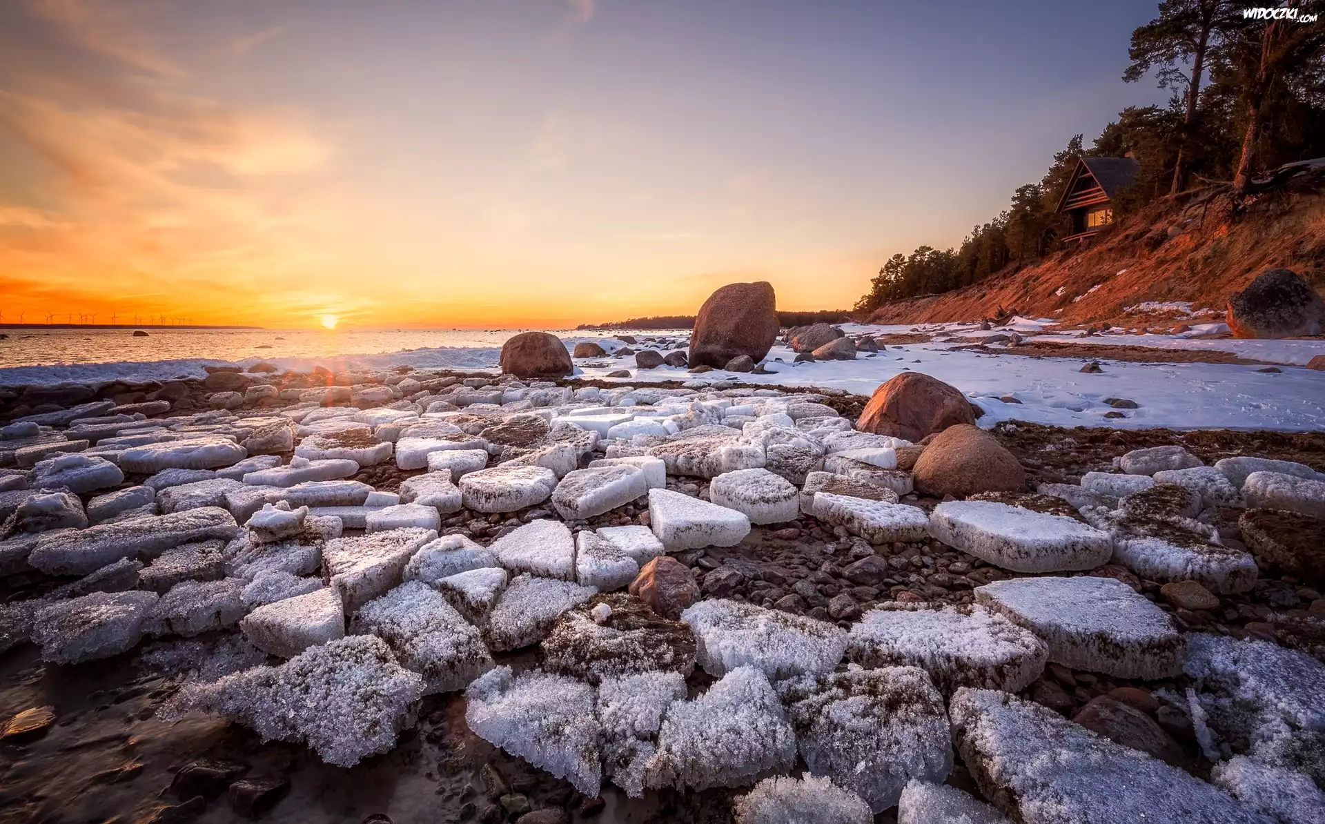 Wschód słońca, Śnieg, Lód, Zima, Skarpa, Drzewa, Domek, Morze, Zatoka Lahepere, Wieś Lohusalu, Prowincja Harjumaa, Estonia |