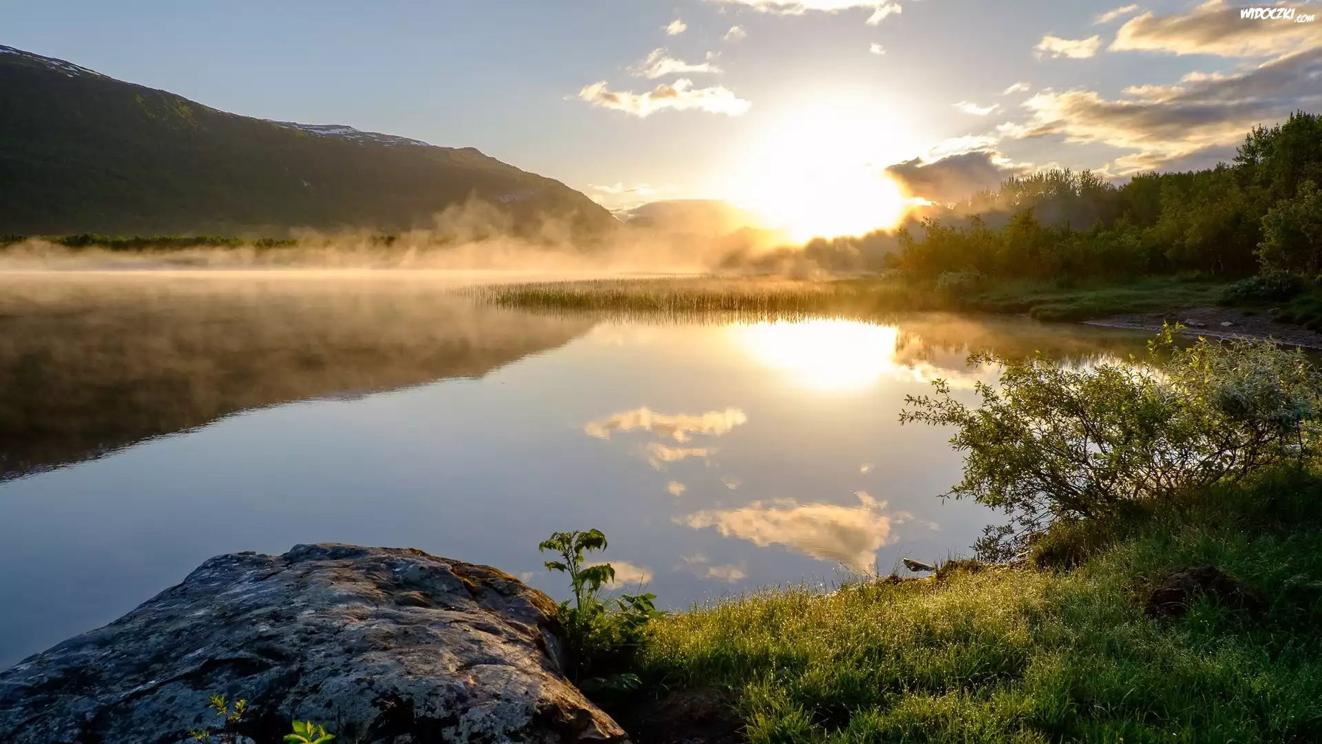 Zdjęcia, Jezioro, Wschód słońca, Mgła, Wzgórza, Drzewa, Chmury