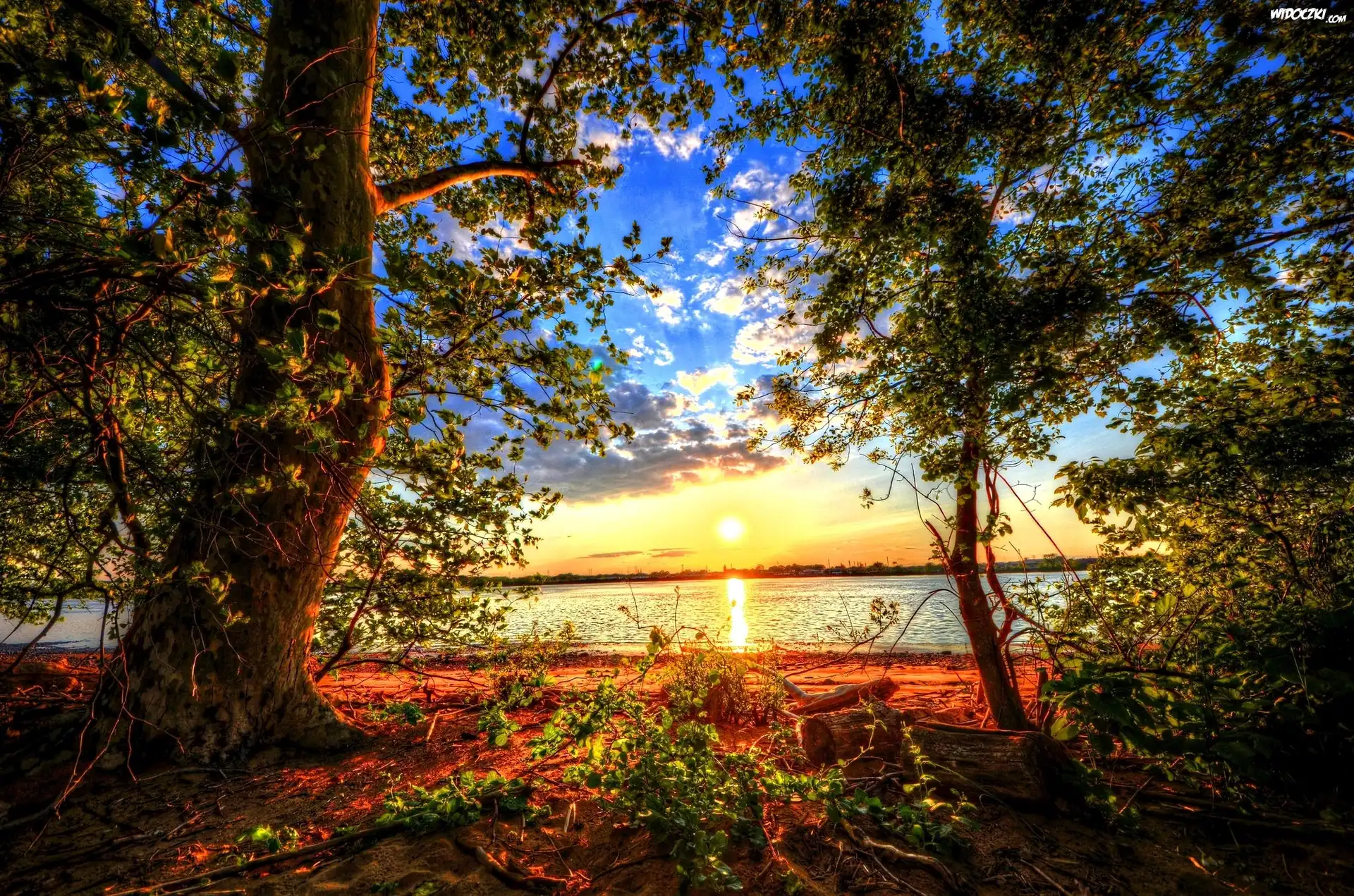 Wschód słońca, Jezioro, Drzewa