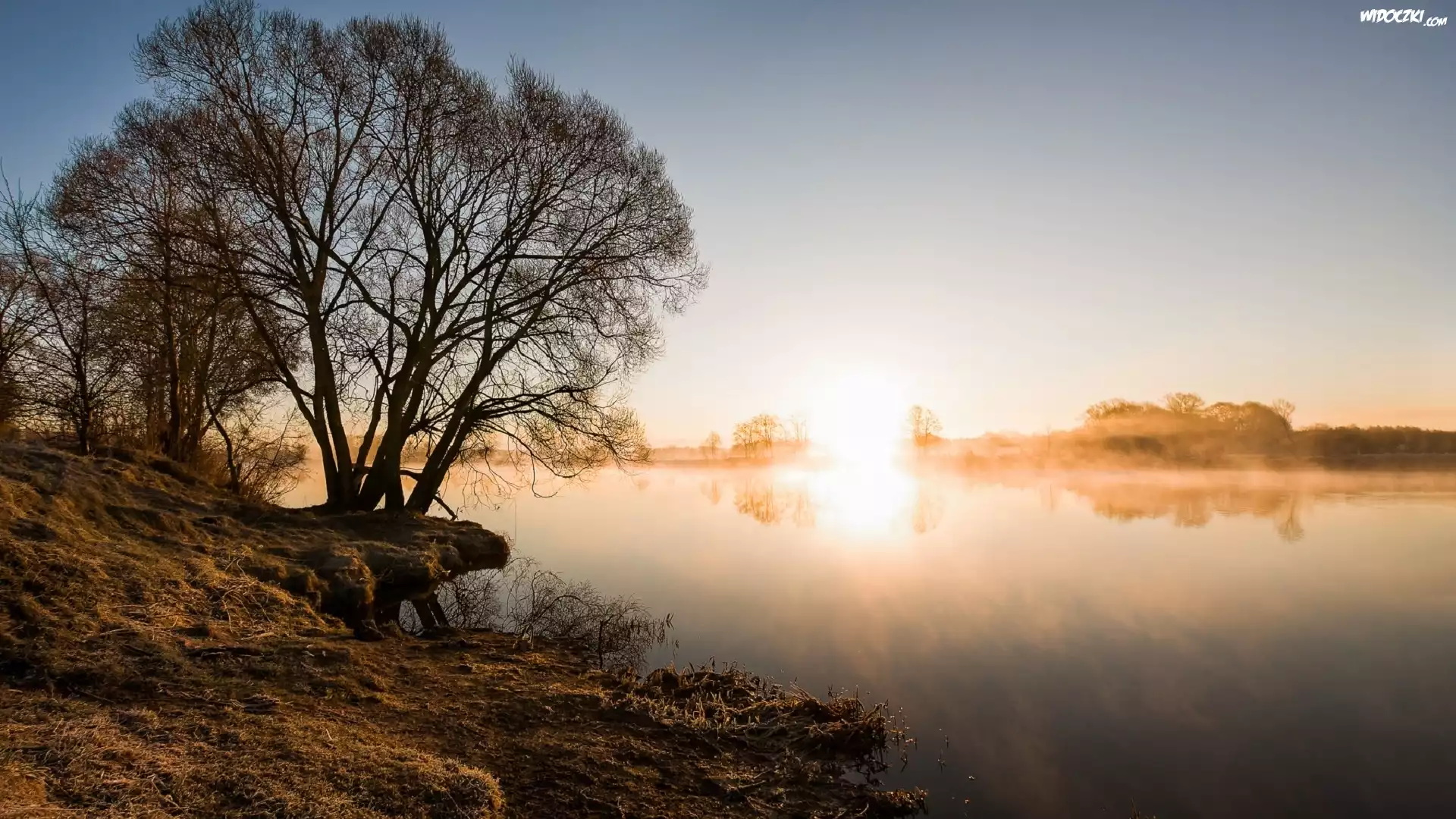 Zdjęcia, Wschód słońca, Jezioro, Drzewa
