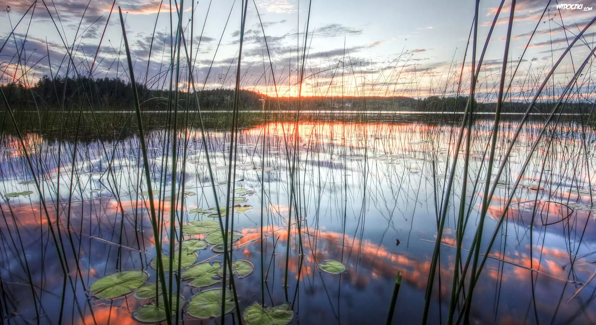 Zdjęcia, Wschód, Słońca, Jezioro, Szuwary