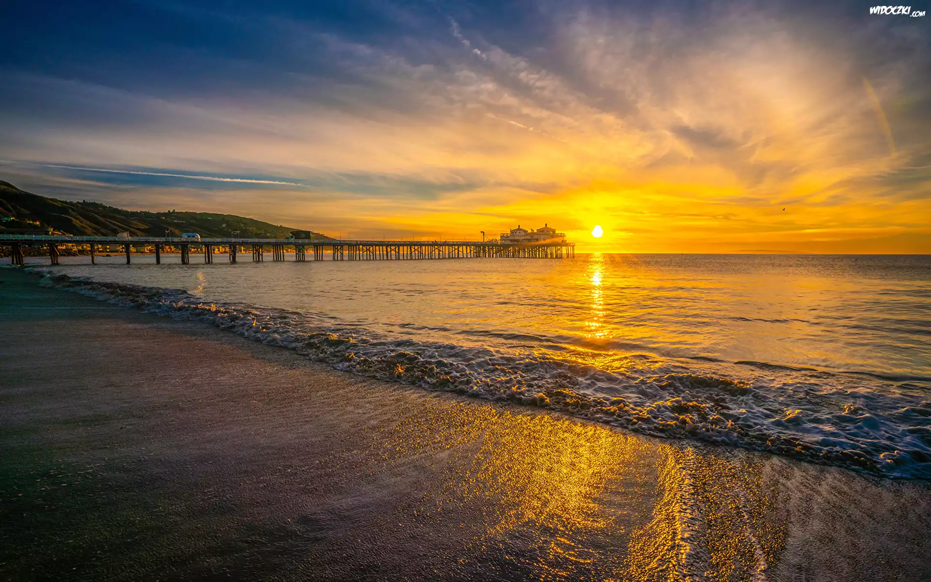 Wschód słońca, Morze, Molo, Plaża, Malibu, Kalifornia, Stany Zjednoczone