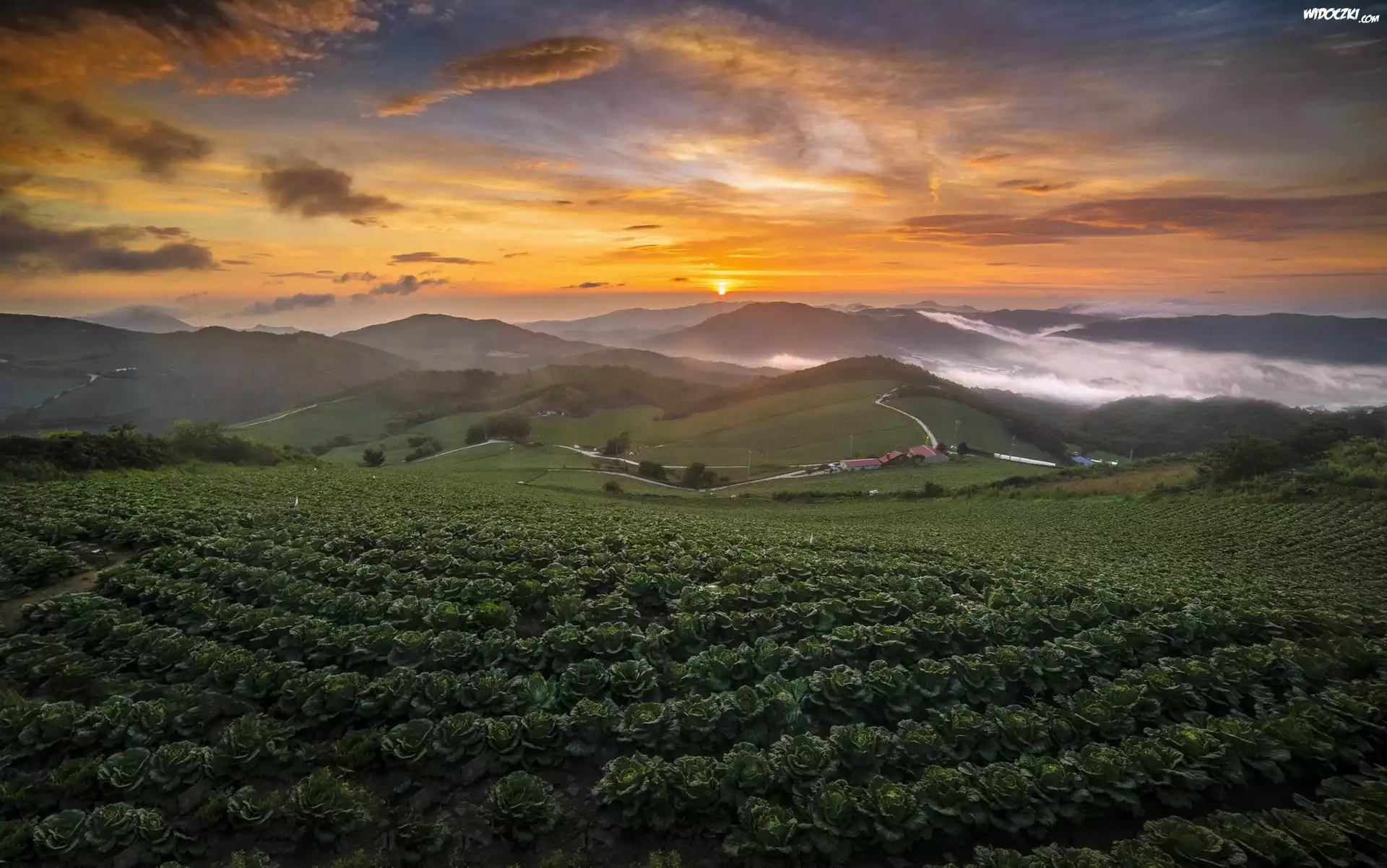 Zdjęcia, Wschód, Słońca, Pole, Kapusty, Góry