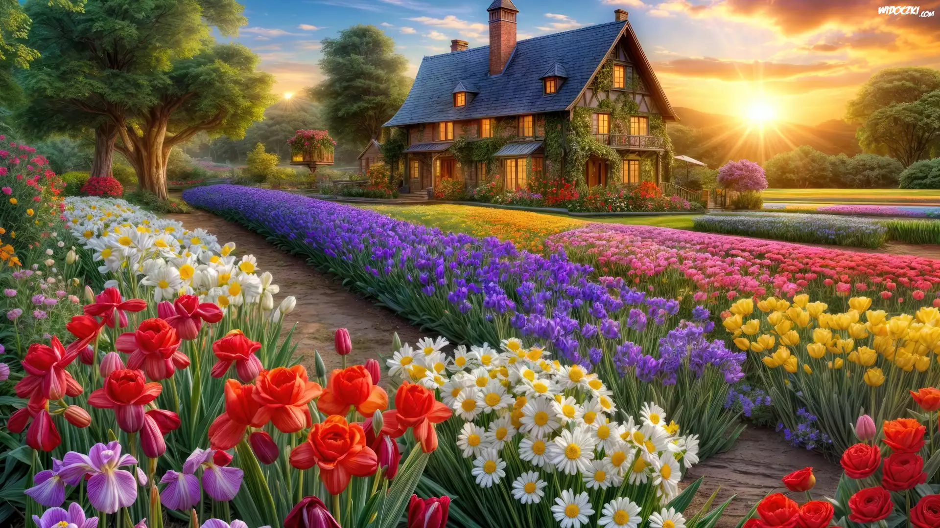 Zdjęcia, Dom, Ogród, Kwiaty, Wschód słońca, Chmury, Grafika
