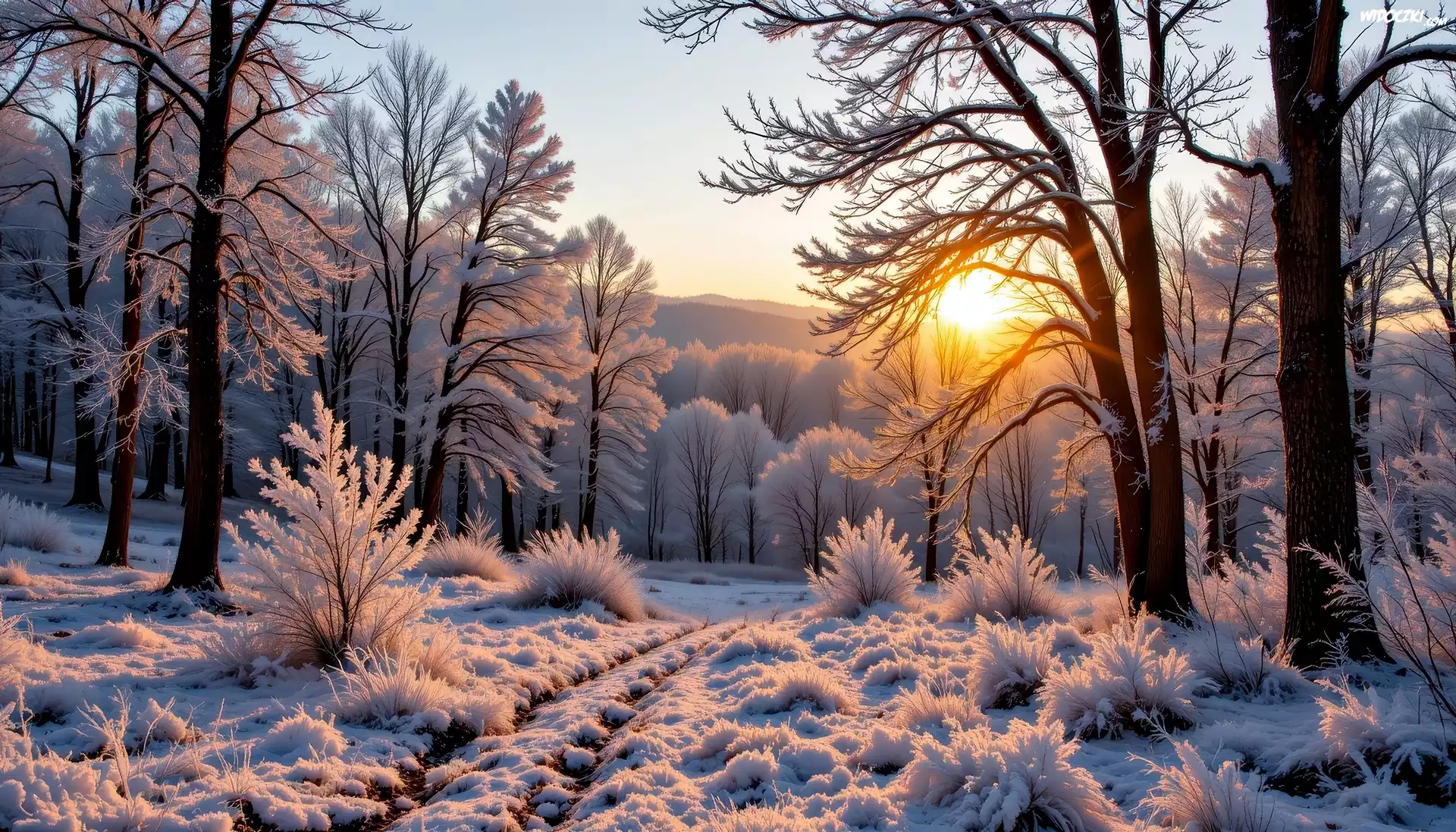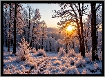 Zdjęcia, Zima, Drzewa, Las, Wschód słońca, Grafika AI