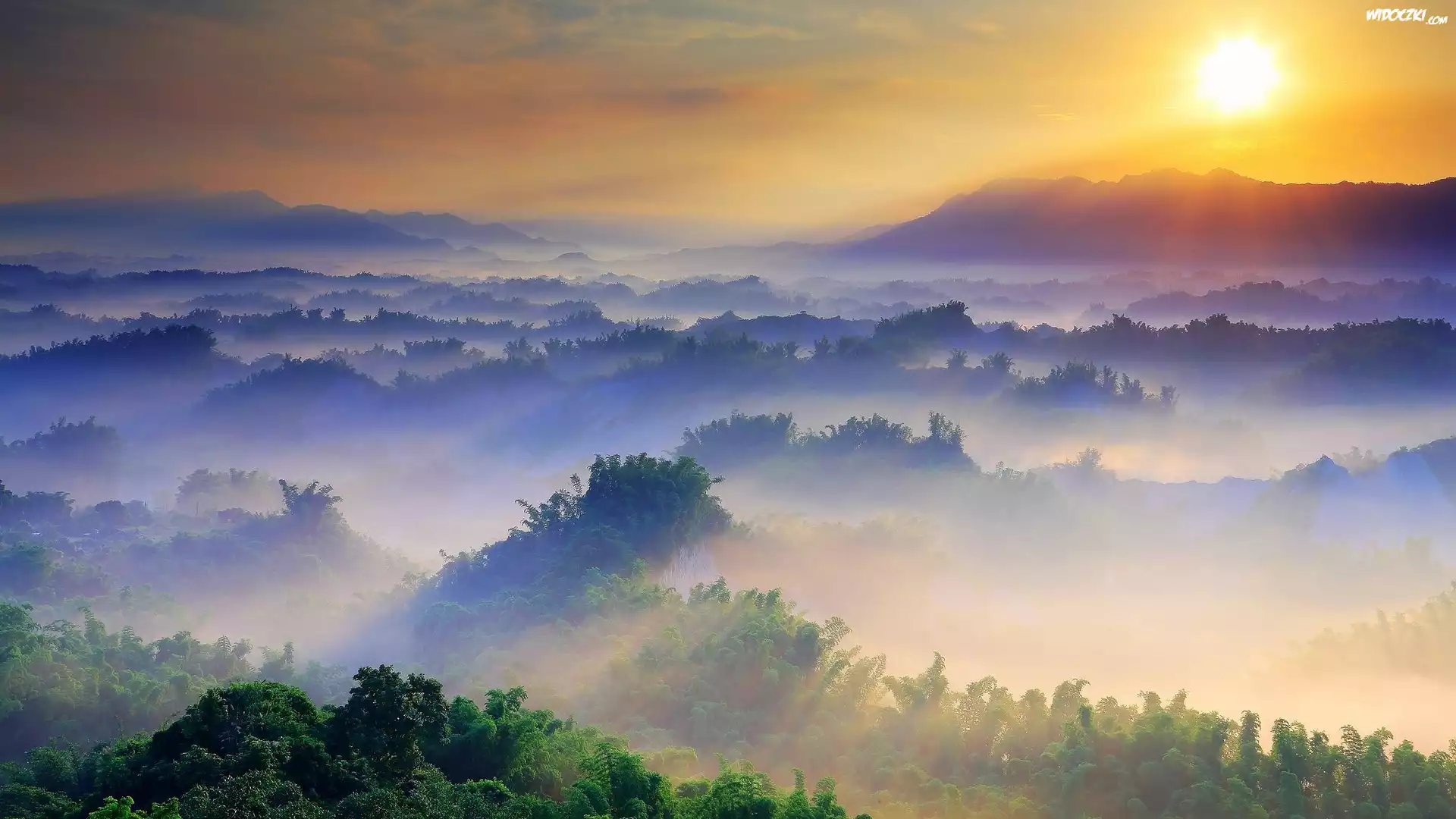 Wschód słońca, Mgła, Lasy, Drzewa