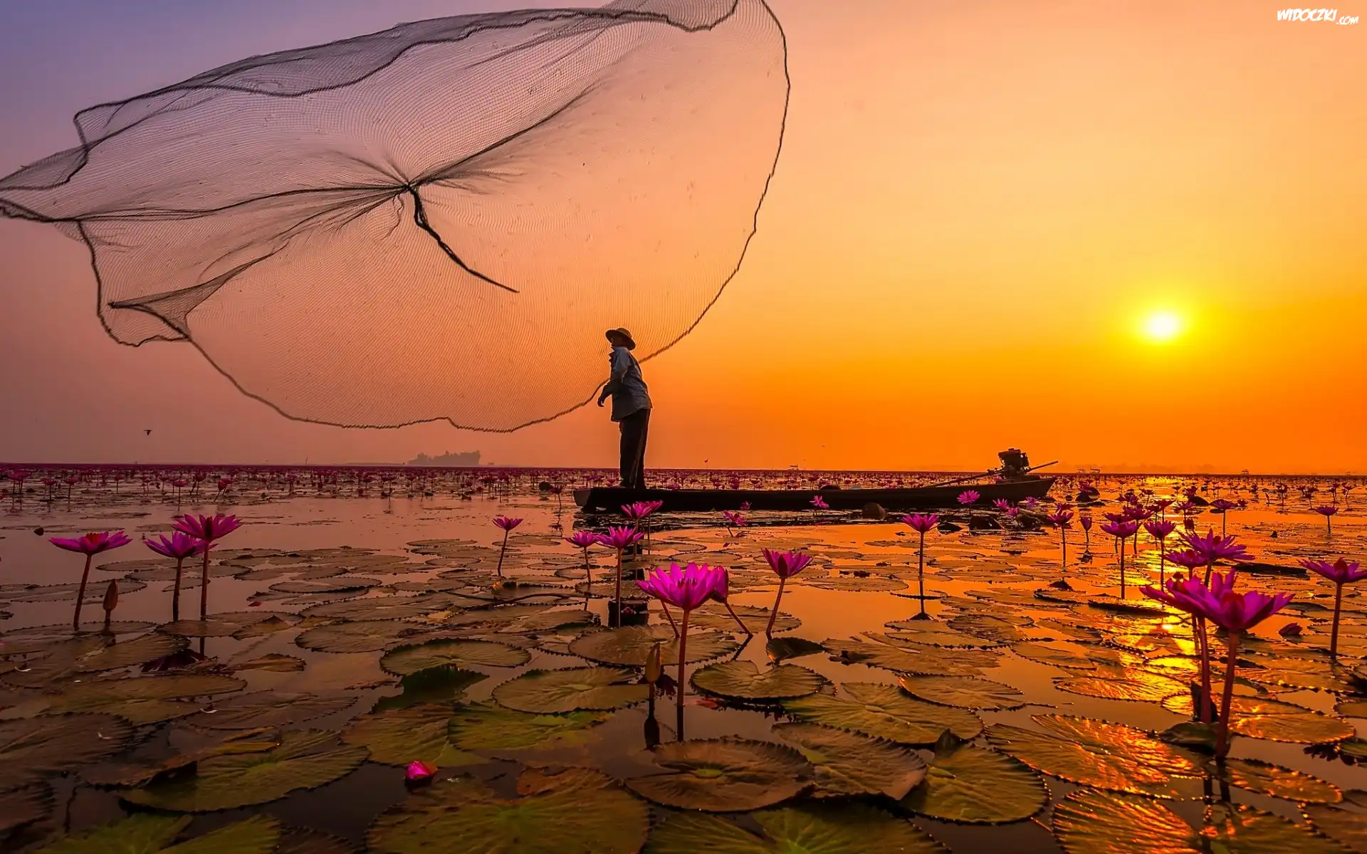Zdjęcia, Wschód, Słońca, Rybak, Sieci, Lilie, Wodne