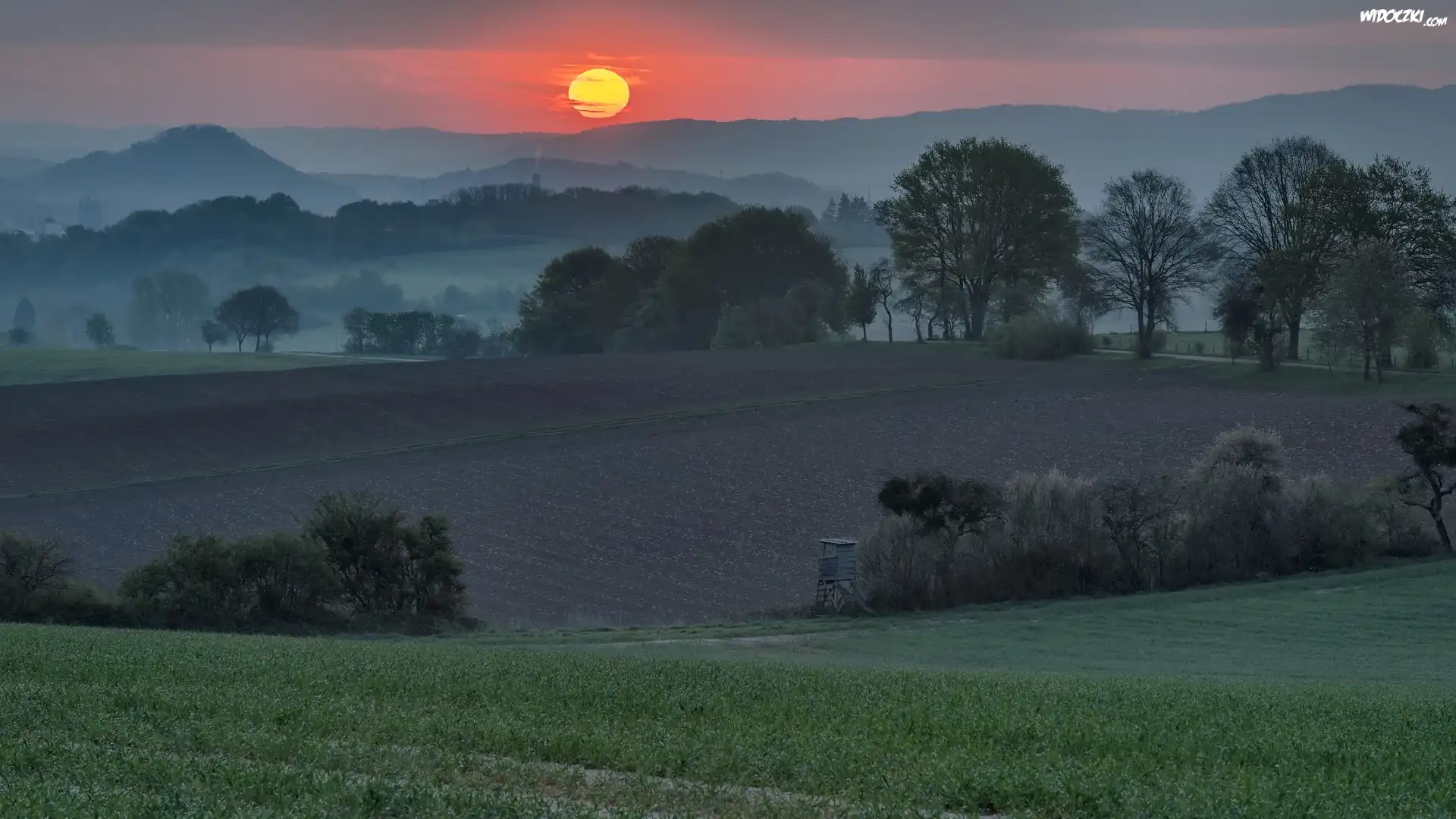 Zdjęcia, Wschód słońca, Pola, Drzewa, Mgła, Wzgórza