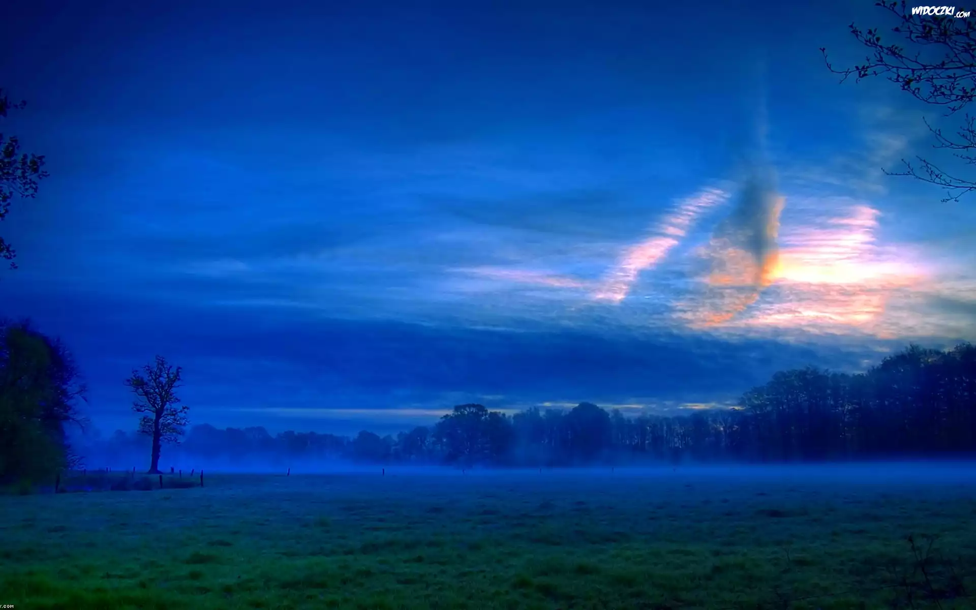 Wschód, Słońca, Poranek, Mgła, Łąka