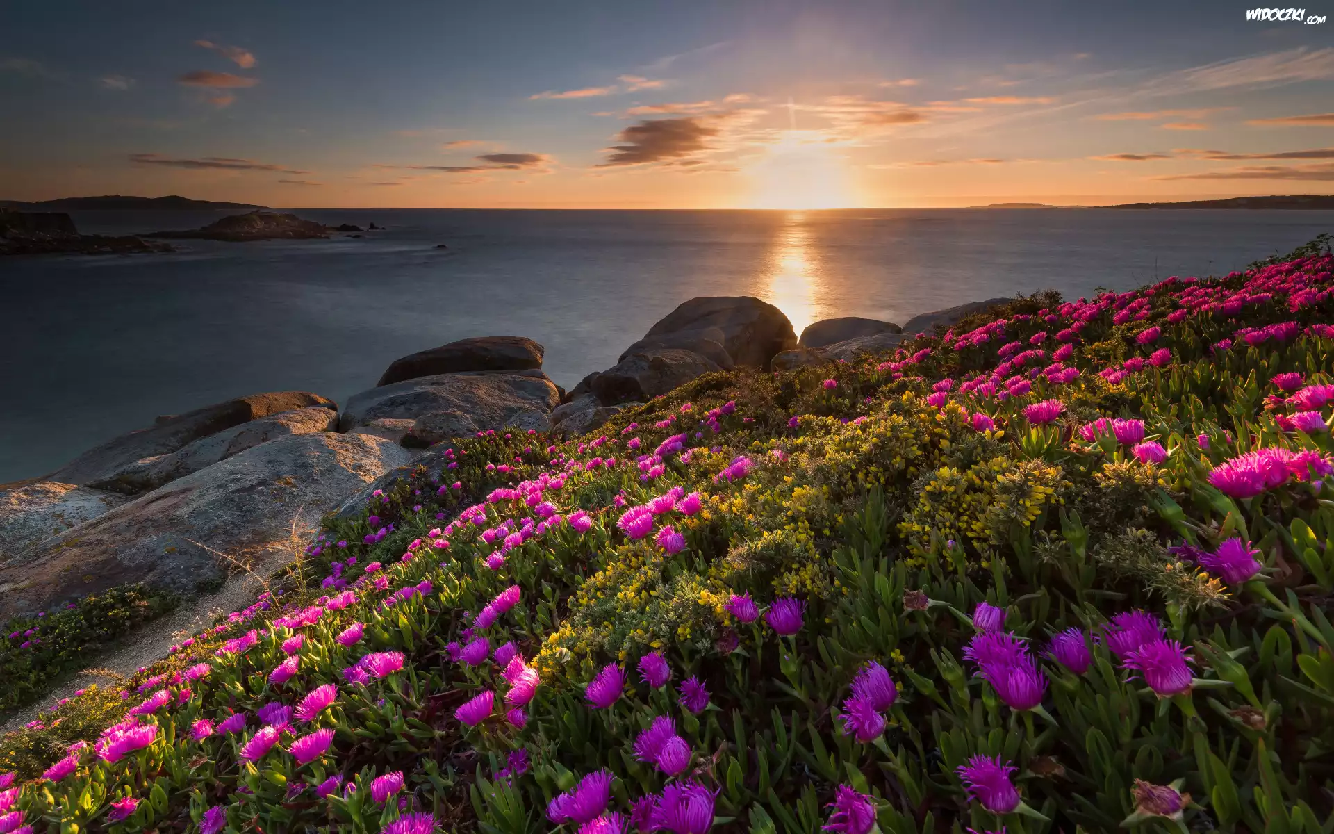 Zdjęcia, Morze, Wschód słońca, Skały, Wybrzeże, Różowe, Kwiaty